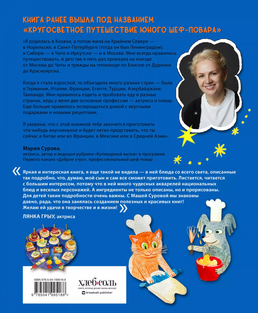 Серия: Кулинария. Готовим с детьми Данная книга стала второй после «Мама, сегодня готовлю Я!» Марии Суровой. «Кругосветное путешествие...» наполнена рецептами для детей, которые любят готовить, только теперь в книге — самые известные блюда со всего мира. Детям будет так же легко приготовить новые блюда, как легко они справлялись с блюдами из первой книги. Поэтому мы решили подбодрить их знакомым названием и возгласом: «Мама, сегодня готовлю Я!» Вас ждут: испанская тортилья, итальянская пицца, русские пельмени и ватрушки, ирландский яблочный пирог, французский рататуй, индийское карри, грузинские хачапури, японские роллы и многое другое. Дерзайте! |