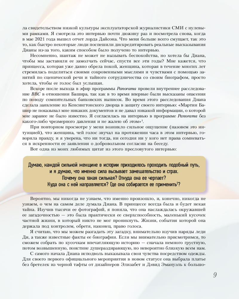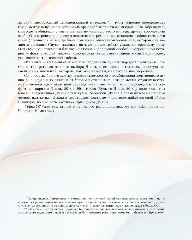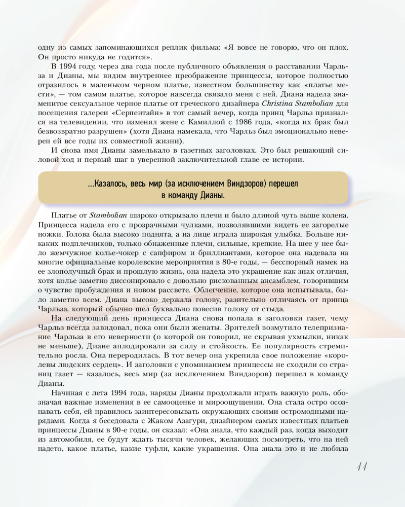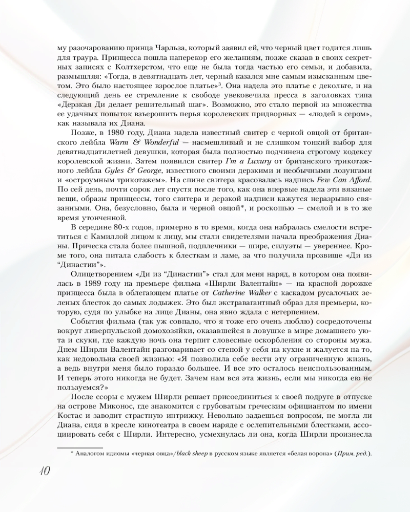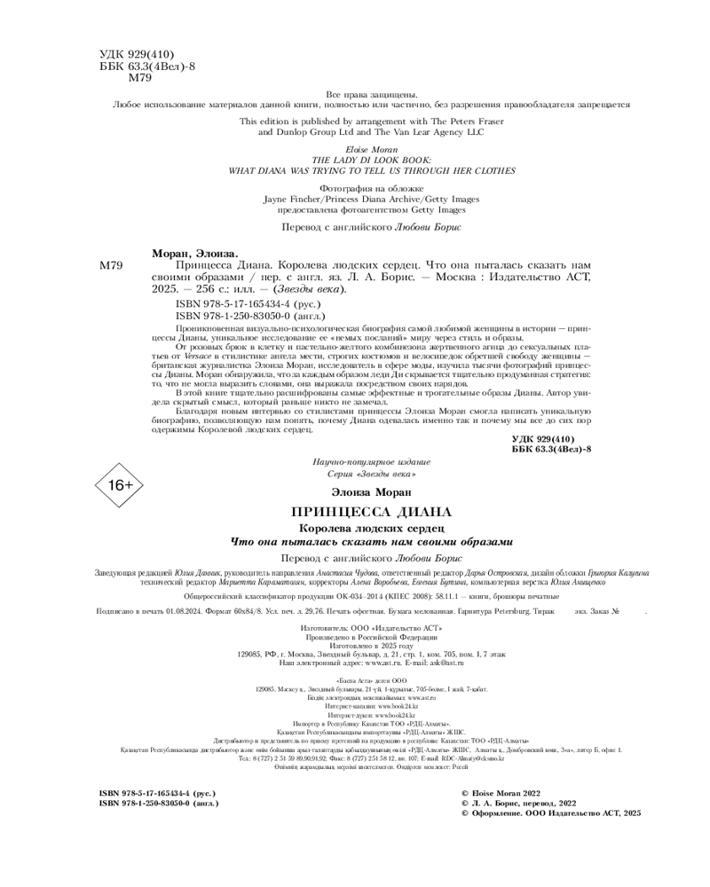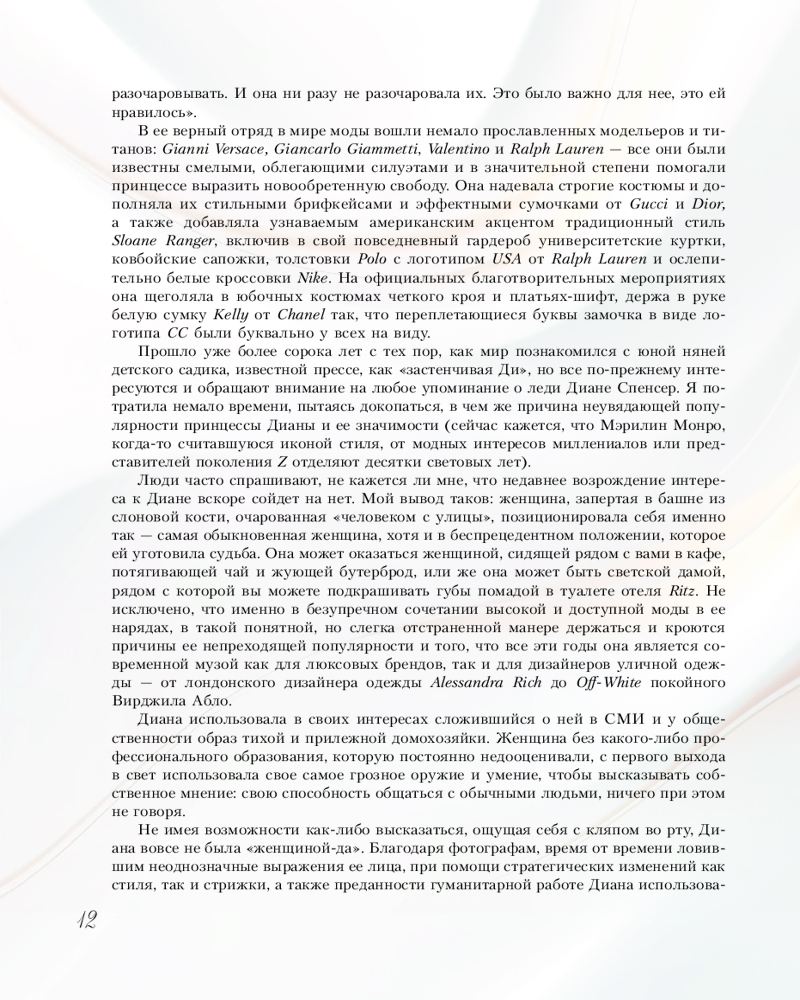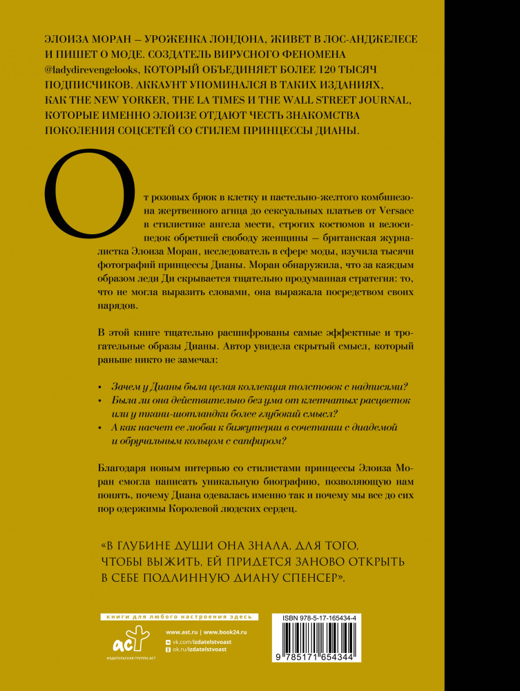 Серия: Звезды века (бол.) От розовых брюк в клетку и пастельно-желтого комбинезона жертвенного агнца до сексуальных платьев от Versace в стилистике ангела мести, строгих костюмов и велосипедок обретшей свободу женщины — британская журналистка Элоиза Моран, исследователь в сфере моды, изучила тысячи фотографий принцессы Дианы. Моран обнаружила, что за каждым образом леди Ди скрывается тщательно продуманная стратегия: то, что не могла выразить словами, она выражала посредством своих нарядов. |
