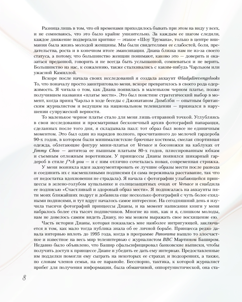 | Элоиза Моран — уроженка Лондона, живет в Лос-Анджелесе и пишет о моде. Создатель вирусного феномена @ladydirevengelooks, который объединяет более 120 тысяч подписчиков. Аккаунт упоминался в таких изданиях, как The New Yorker, The LA Times и The Wall Street Journal, которые именно Элоизе отдают честь знакомства поколения соцсетей со стилем принцессы Дианы. |