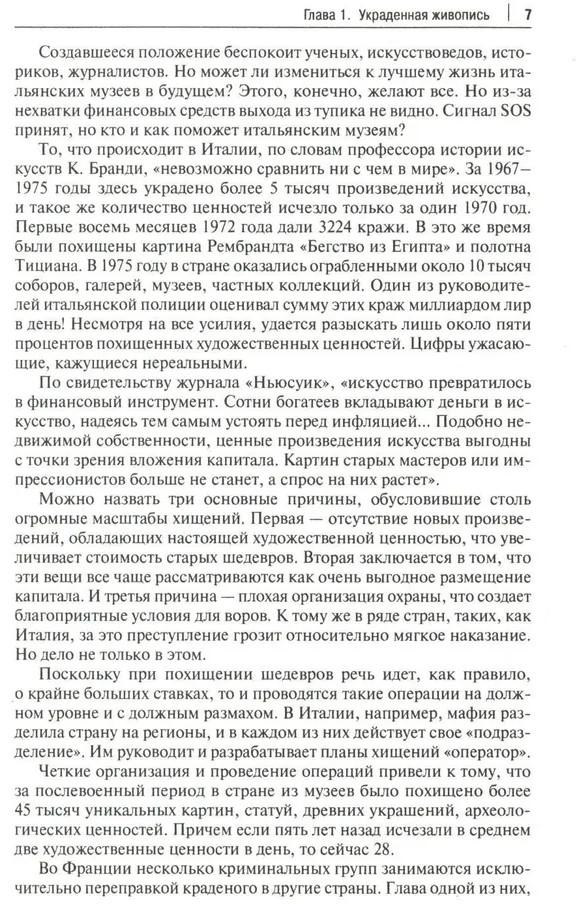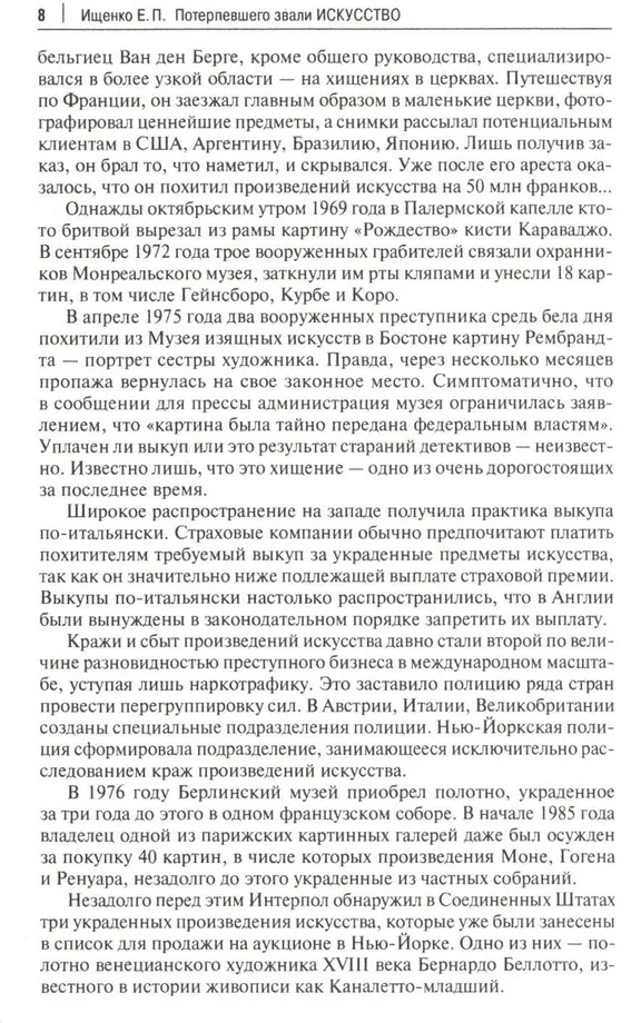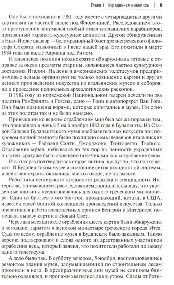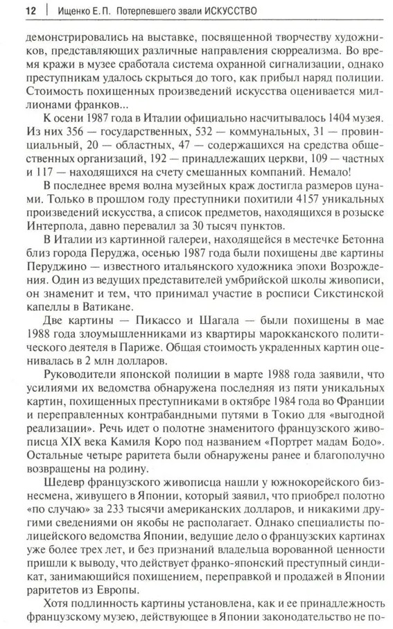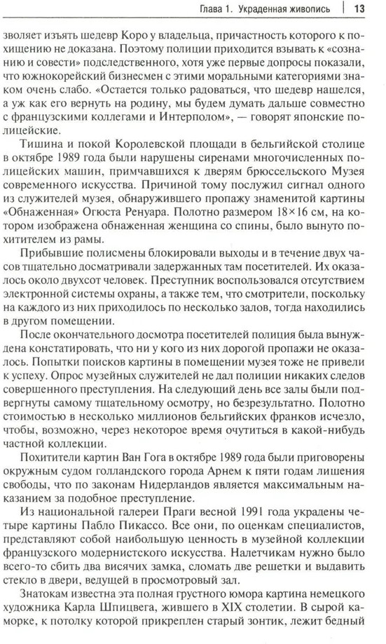 Потерпевшего звали искусствоВ данный момент этот товар отсутствует в продаже. Возможно, у нас найдется аналогичный или похожий товар здесь. Преступные посягательства на произведения искусства, хранящиеся в музеях, галереях, частных коллекциях, очень разнообразны. Это кражи, грабежи, разбойные нападения с целью завладения ими, фальсификации работ старых мастеров и их последователей, мошеннические операции с подделками, нередко очень искусными. Не оставят читателей равнодушными и акты вандализма над картинами, скульптурами, рисунками. Надлежащее внимание уделено особой области творчества — реставрации и атрибуции произведений искусства, а также криминальному бизнесу на древностях, в особенности находках археологов. Рассмотрены и методы повышения творческих способностей человека, неравнодушного к искусству. Для широкого круга читателей. |