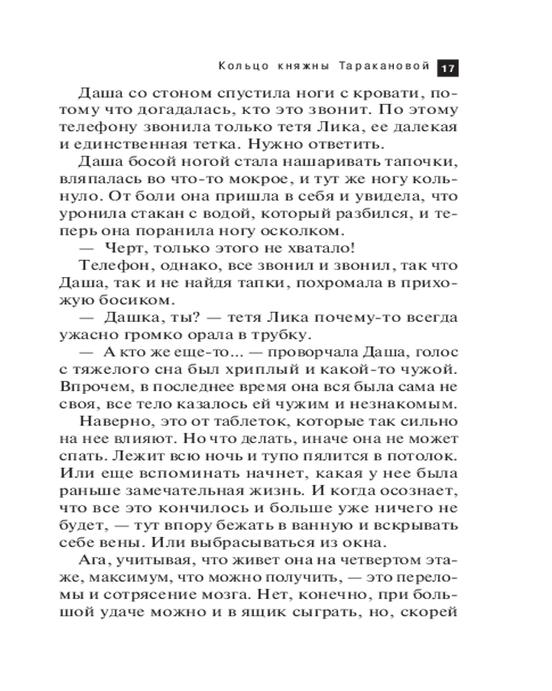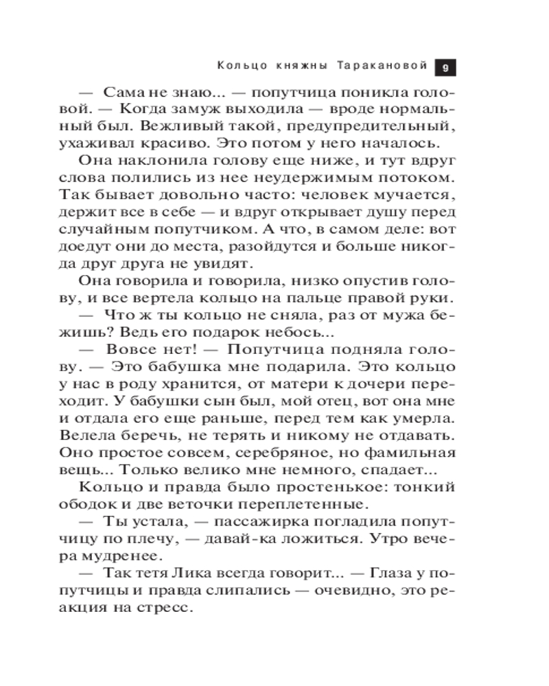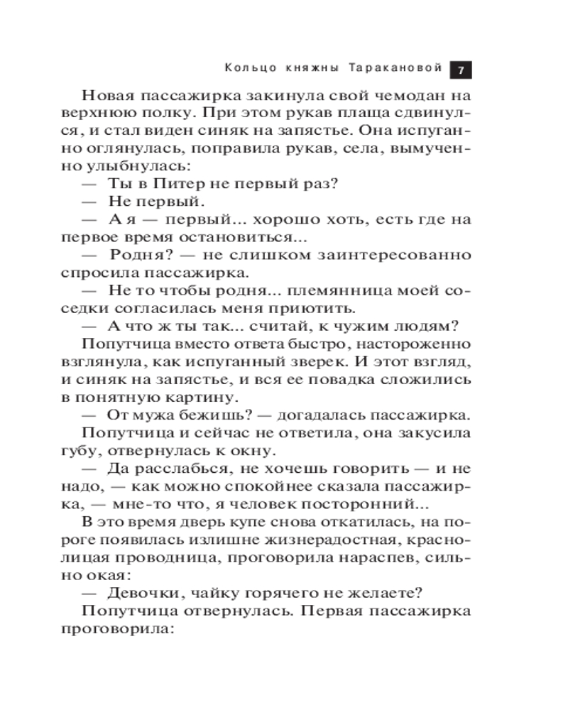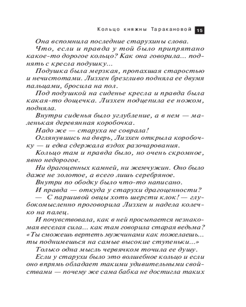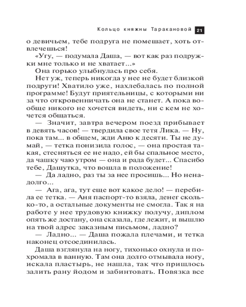 В данный момент этот товар отсутствует в продаже. Возможно, у нас найдется аналогичный или похожий товар  здесь. Серия: Артефакт & Детектив. Новое оформление (обложка) По легенде, у княжны Таракановой было необыкновенное кольцо, обладающее магическими силами. Оно могло влиять на характер своей владелицы... В наше время старинное кольцо попадает в руки робкой учительницы Ани, которая решается укрыться от жестокого мужа у Даши, племянницы ее доброжелательной соседки. Однако приезжает к Даше совсем не застенчивая девушка, а весьма смелая дама. И странности на этом не заканчиваются! Однажды Даша возвращается домой и находит в шкафу убитого Аниного мужа! А таинственной гостьи и след простыл. Кто убил мужа и что он делал в Дашиной квартире? Девушка отправляется на поиски и выясняет, что гостьей была вовсе не Аня, а выдававшая себя за нее незнакомка...  |
