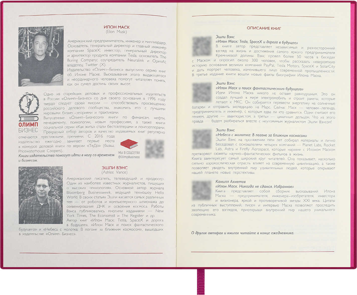 Escalada Ежедневник недатированный «Илон Маск»В данный момент этот товар отсутствует в продаже. Возможно, у нас найдется аналогичный или похожий товар здесь. Недатированный ежедневник предназначен для ведения записей. Отсутствие дат делает его уникальным товаром, которым можно начать пользоваться в любое время года. Отличное сочетание интересного дизайна и современного материала. Сделайте ваши рабочие будни чуть более красочными и приятными. |