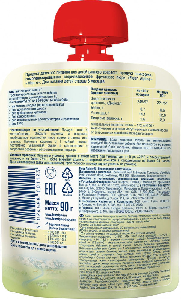 💳 Оплатить за товар можно при получении 🇰🇿 Есть бесплатная доставка по Казахстану от 1 дня 🎁 Копите бонусы с каждой покупки Пюре Fleur Alpine МАНГО дополняет рацион малыша новым экзотическим фруктом. В его вкусе и аромате вы почувствуете только спелое, согретое солнцем манго. Пюре имеет однородную, очень нежную консистенцию. Упаковку-пауч удобно брать с собой на прогулку или в поездку. |