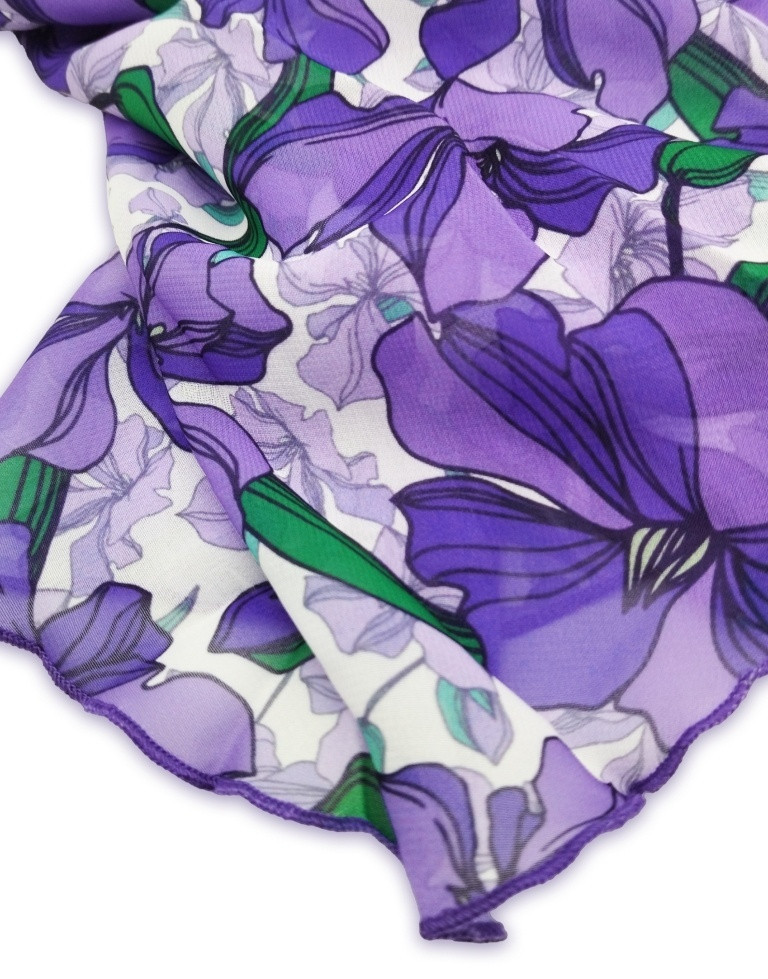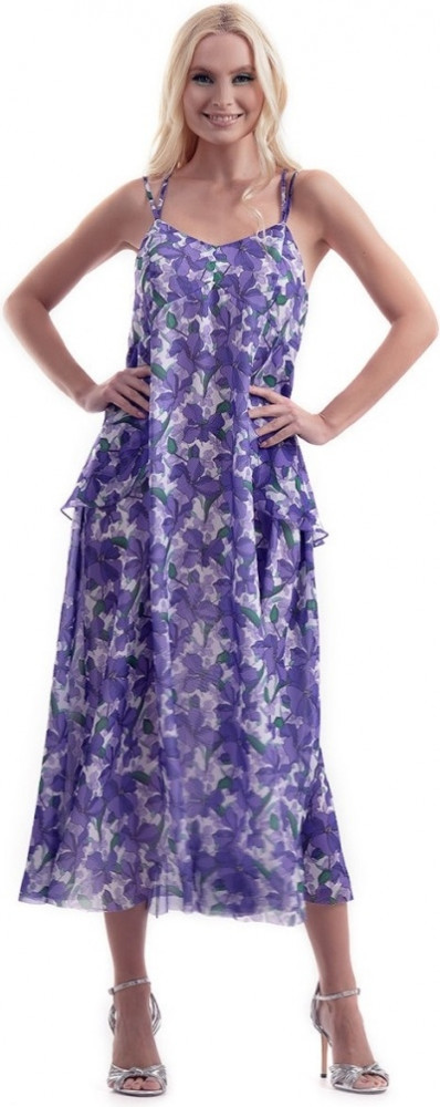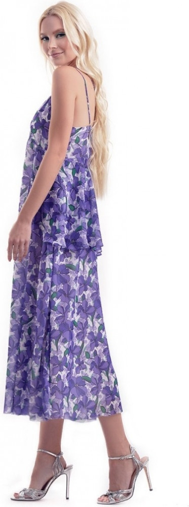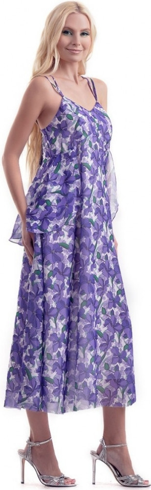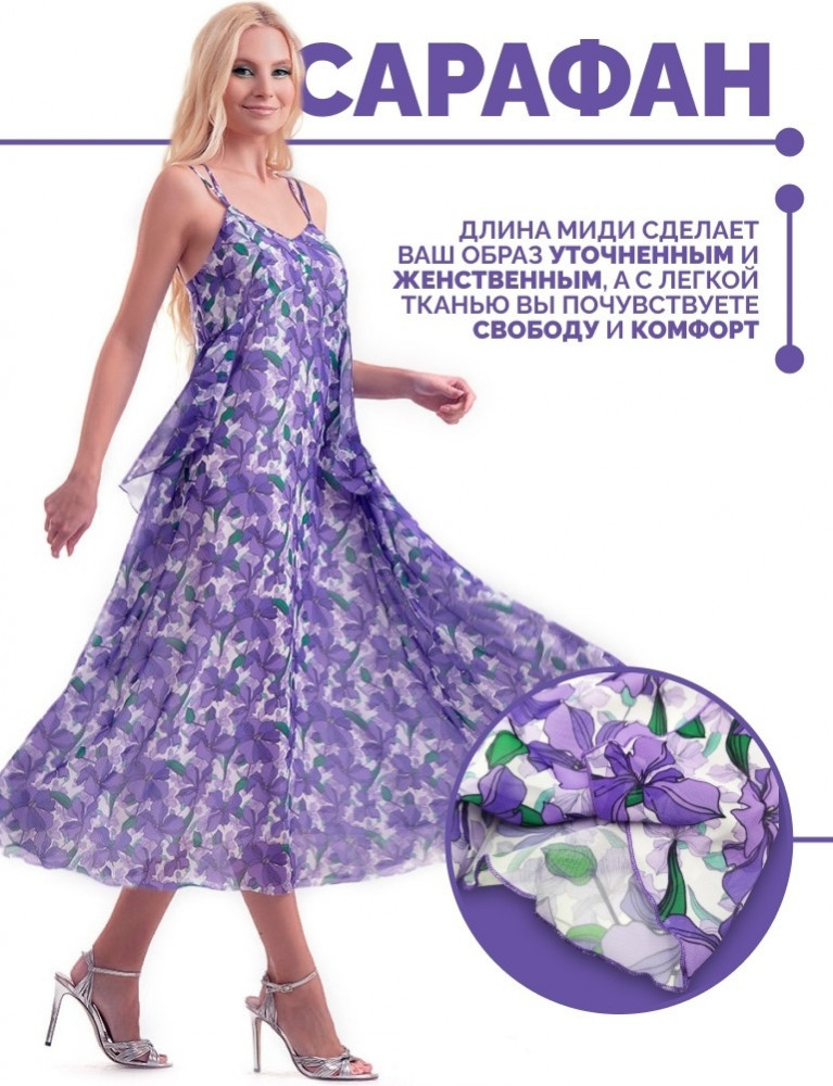 Открытый сарафан из шифона с модным принтом, на тонких лямках. Сарафан с подрезом под грудью и отлетной баской. Застежка сбоку на молнию. Сарафан на подкладке.