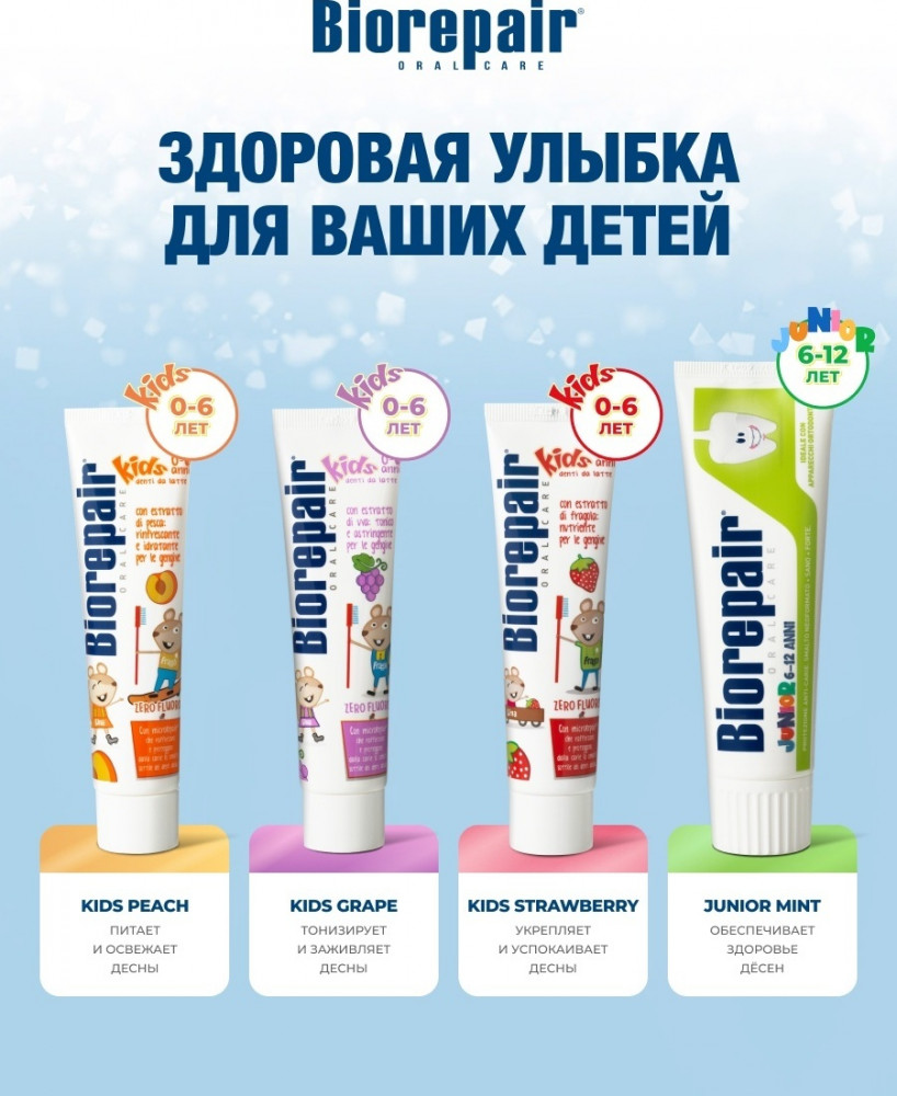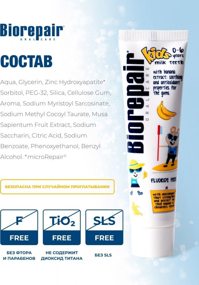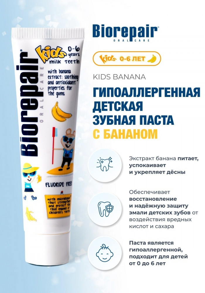 Зубная паста с экстрактом банана для детей от 0 до 6 лет. Эмаль детских зубов более тонкая и уязвимая, чем эмаль коренных. Поэтому очень важно восстанавливать эмаль и защищать ее от воздействия кислот и сахаров. Biorepair Kids – единственная зубная паста, содержащая частицы microRepair, которые укрепляют эмаль молочных зубов, способствуя правильному развитию и здоровью коренных. Её эффективность клинически протестирована. Не содержит фтор, абразивный кремний, диоксид титана, содиум лаурил сульфат, парабены и красители. Укрепляет детскую эмаль, обладает антибактериальным эффектом. Борется c меловидными пятнами на молочных зубах, предотвращает образование налета и зубного камня.