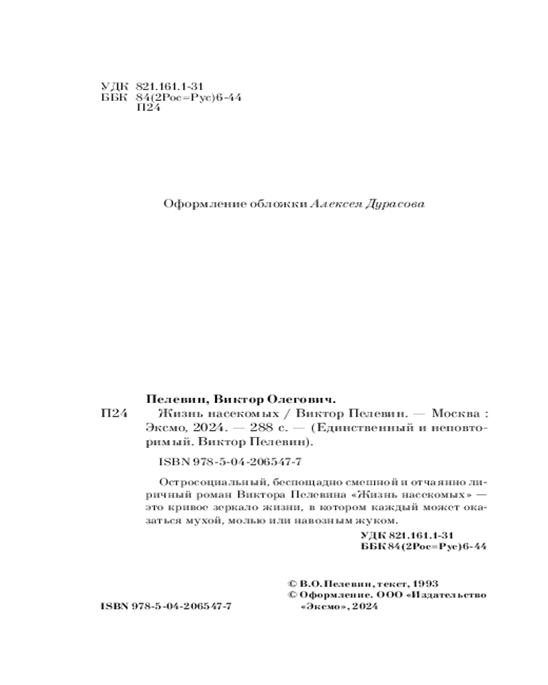 Серия: Единственный и неповторимый. Виктор Пелевин (обложка) Остросоциальный, беспощадно смешной и отчаянно лиричный роман Виктора Пелевина «Жизнь насекомых» — это кривое зеркало жизни, в котором каждый может оказаться мухой, молью или навозным жуком. Новое оформление теперь в мягкой обложке. |