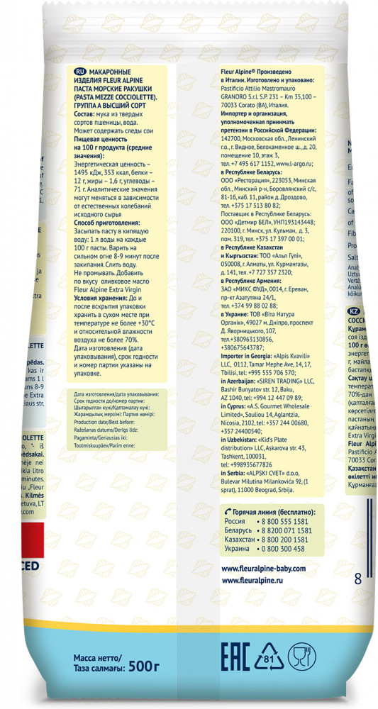 💳 Оплатить за товар можно при получении 🇰🇿 Есть бесплатная доставка по Казахстану от 1 дня 🎁 Копите бонусы с каждой покупки Макароны Морские Ракушки — продукт для всей семьи, который родители могут предложить малышу, когда в его меню уже входят блюда общего стола. Добавьте немного оливкового масла первого холодного отжима Fleur Alpine в свежеприготовленную пасту, и ребенок обязательно оценит новое для него блюдо. |