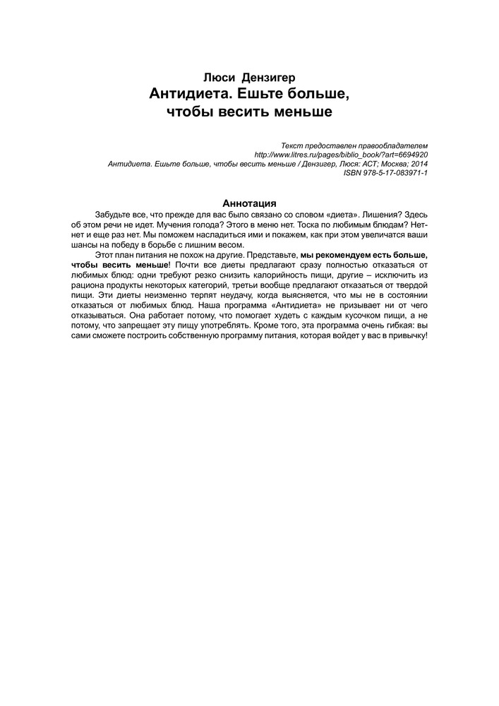 АнтидиетаВ данный момент этот товар отсутствует в продаже. Возможно, у нас найдется аналогичный или похожий товар здесь. Серия: Анти... Забудьте все, что прежде для вас было связано со словом «диета». Лишения? Здесь об этом речи не идет. Мучения голода? Этого в меню нет. Тоска по любимым блюдам? |