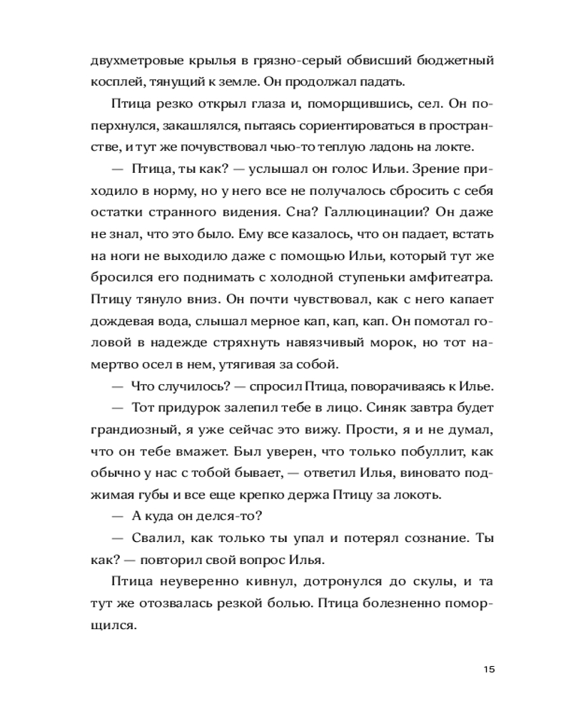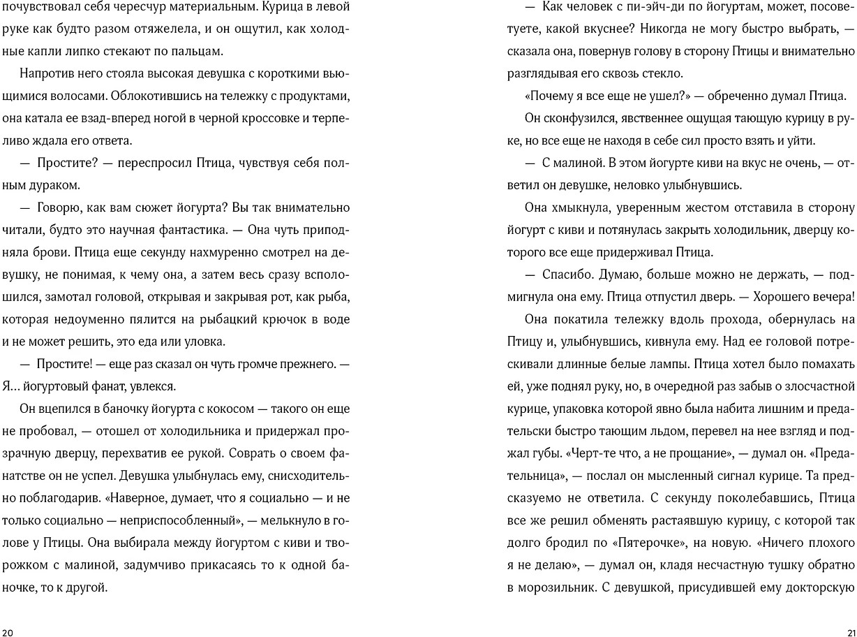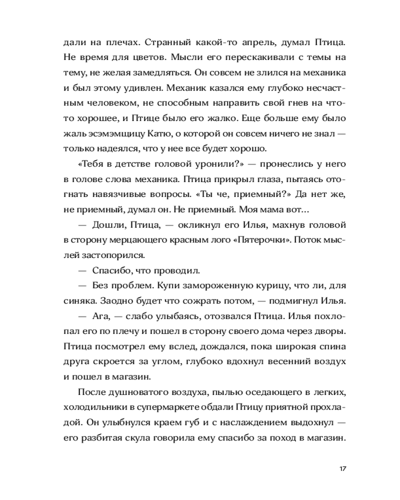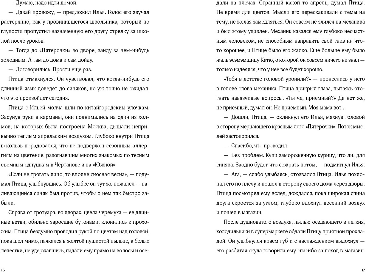 Птица — студент философского факультета и ценитель йогуртов из «Пятерочки», живет в съемной квартирке и тусуется с друзьями после пар. Но однажды во время прогулки он ввязывается в драку, и с ним начинает твориться что‑то странное. Загадочные сны, зуд между лопаток, тщетные попытки понять, кто он и откуда. Наконец буквы в паспорте рассыпаются в пыль у него на глазах и Птица вспоминает, что на самом деле он... ангел. |