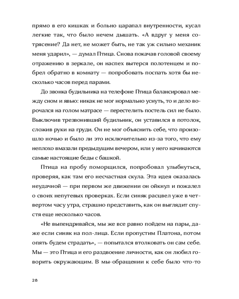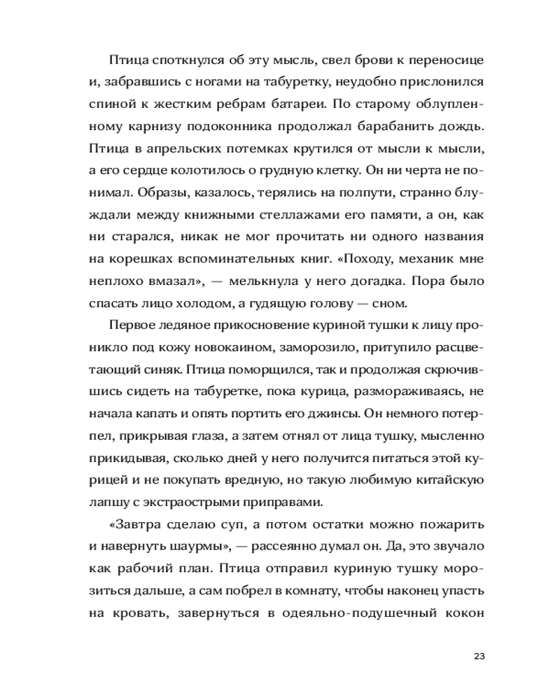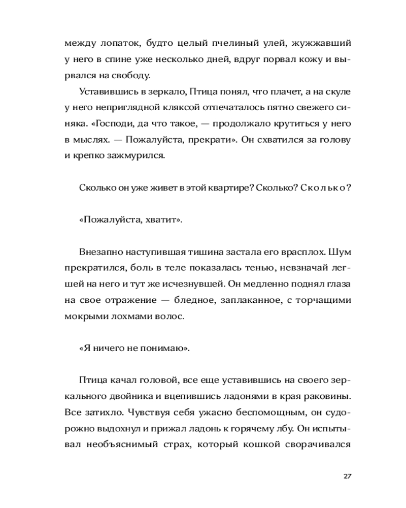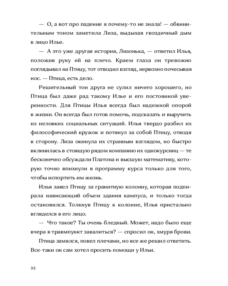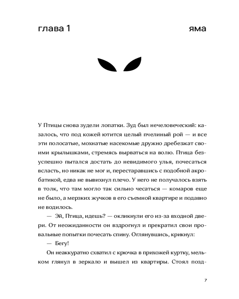 Птица — студент философского факультета и ценитель йогуртов из «Пятерочки», живет в съемной квартирке и тусуется с друзьями после пар. Но однажды во время прогулки он ввязывается в драку, и с ним начинает твориться что‑то странное. Загадочные сны, зуд между лопаток, тщетные попытки понять, кто он и откуда. Наконец буквы в паспорте рассыпаются в пыль у него на глазах и Птица вспоминает, что на самом деле он... ангел. |