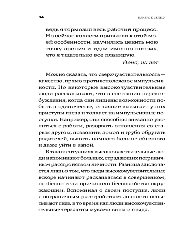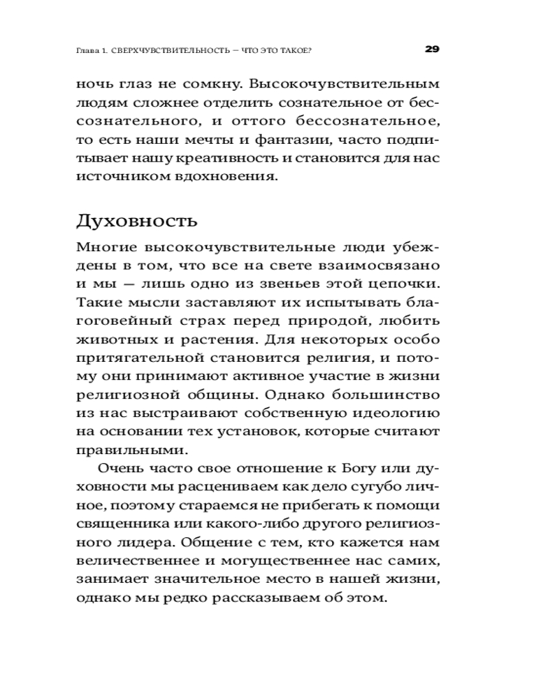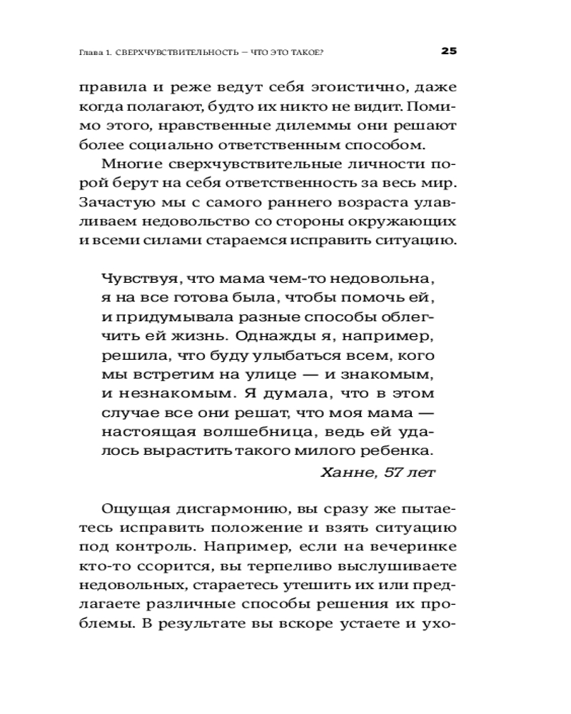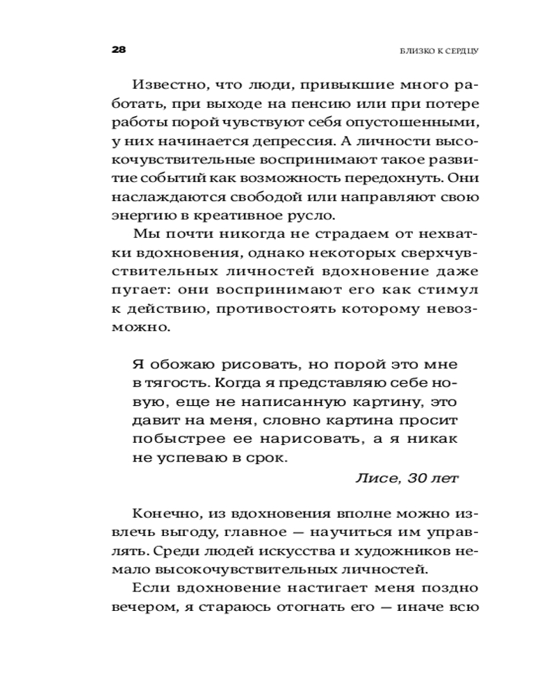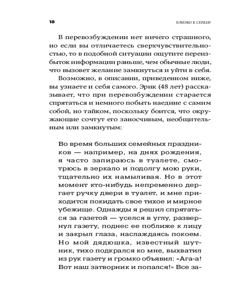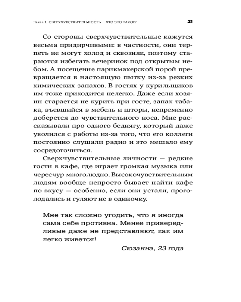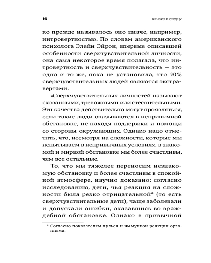 💳 Оплатить за товар можно при получении 🇰🇿 Есть бесплатная доставка по Казахстану 🎁 Копите бонусы с каждой покупки Высокочувствительные люди или новые интроверты — так называют тех, кто острее других реагирует на шум или суету, быстро устает от общества и любит уединение. Эти люди тонко чувствуют мир и обращают внимание на мельчайшие детали, поэтому из них нередко получаются прекрасные поэты, художники и писатели. Однако жить среди других им тяжело: слишком часто приходится оправдываться за свою усталость и нелюдимость, слишком ранит критика, слишком много сил уходит на сопереживание, а также на то, чтобы соответствовать принятым в обществе стандартам. |