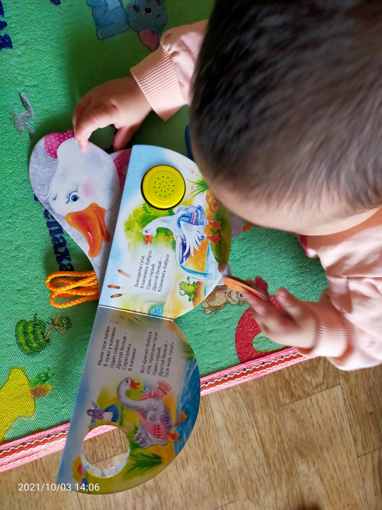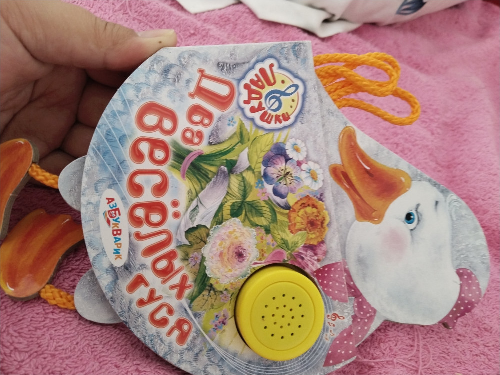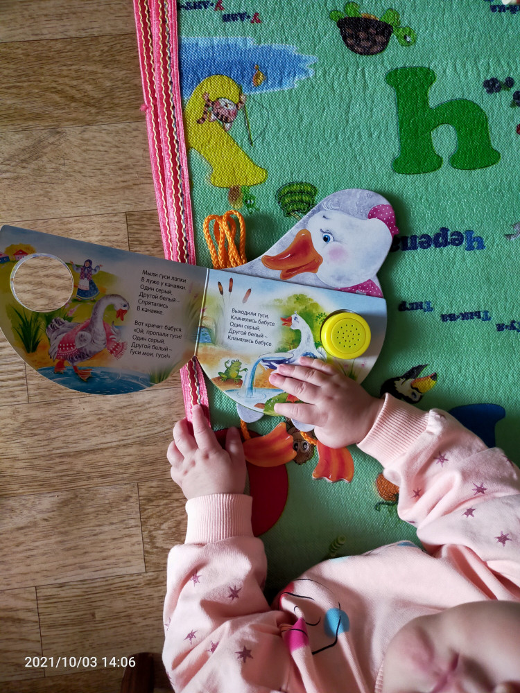 Хорошая музыкальная книжка. звук не тихий и не слишком громкий, картон плотный. Дочке 1годик, пока знает только эту песенку, поэтому купила. в книжке несколько потешек, но играет песня только 2 весёлых гуся.
