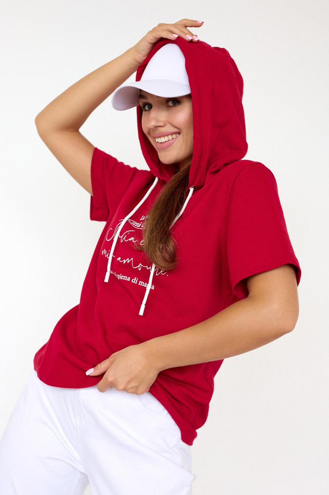 супер футболка! трикотаж приятный 100% хлопок давно такую хотела! чтоб с капюшоном! цвет скорее персиковый-очень красивый! покупкой очень довольна!