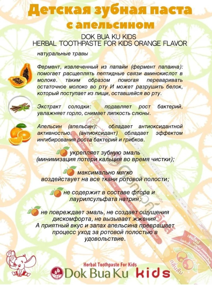 Растительные ингредиенты тайской зубной пасты уменьшают развитие бактерий во рту, придают свежесть дыханию. Натуральные компоненты не наносят вреда организму ребенка при случайном проглатывании. Тайская зубная паста не повреждает эмаль, не создает ощущения дискомфорта, не вызывает жжения. А приятный вкус и запах апельсина превращает процесс уход за ротовой полостью в удовольствие.