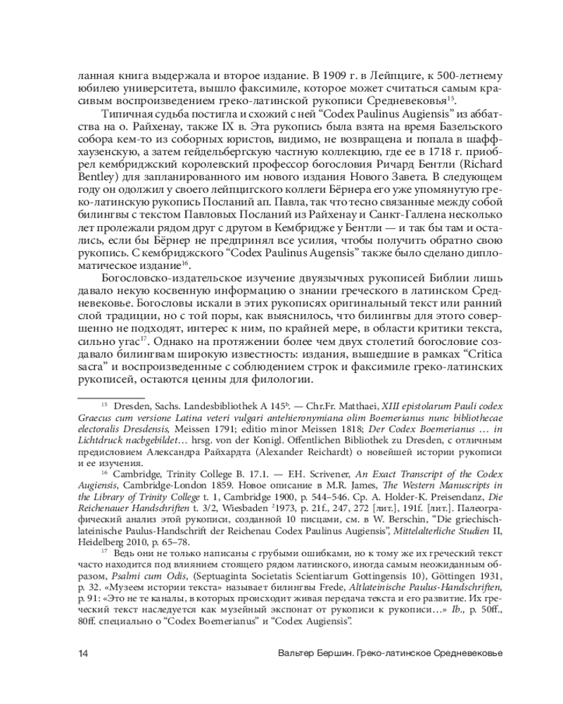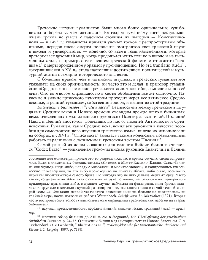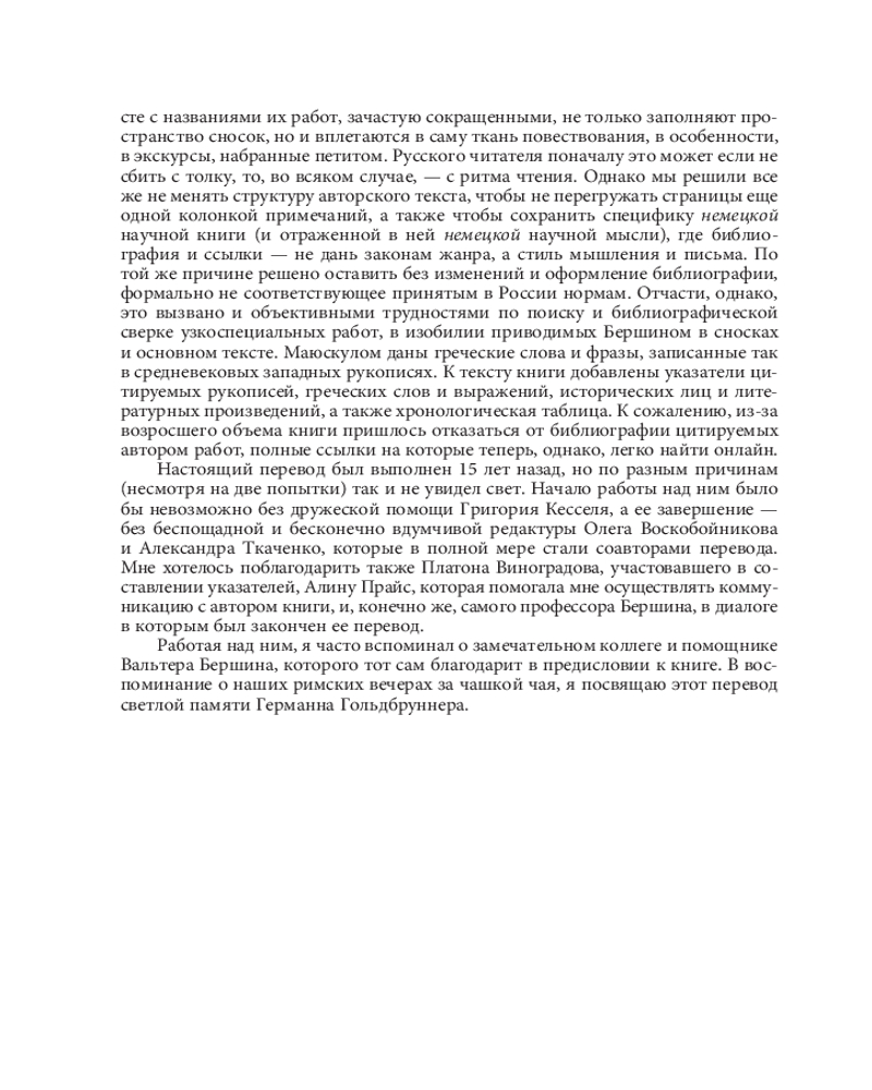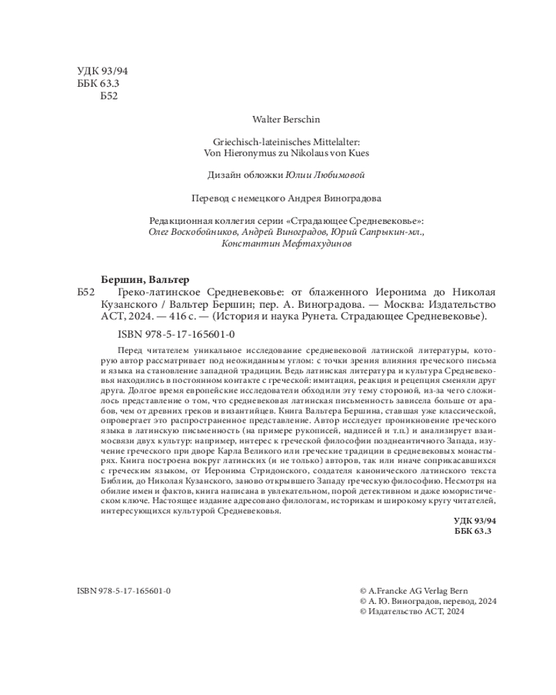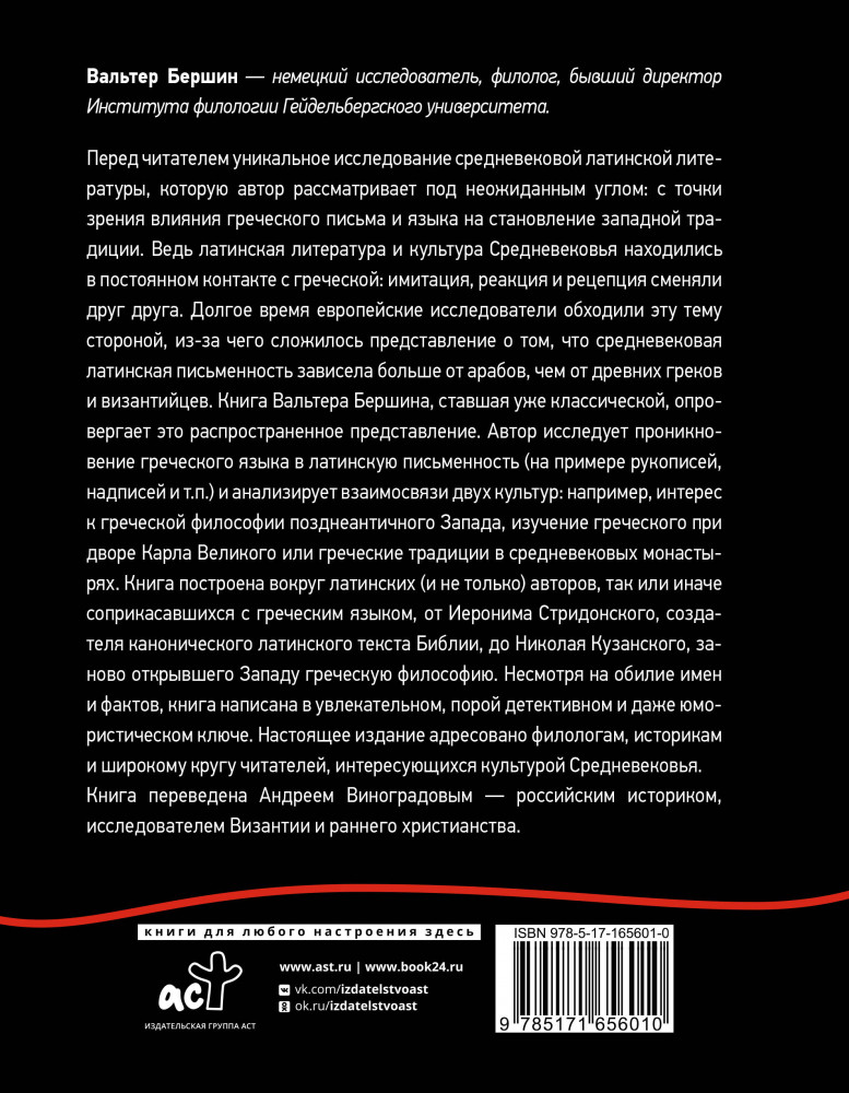 Серия: История и наука рунета. Страдающее средневековье Вальтер Бершин — немецкий исследователь, филолог, бывший директор Института филологии Гейдельбергского университета. Перед читателем уникальное исследование средневековой латинской литературы, которую автор рассматривает под неожиданным углом: с точки зрения влияния греческого письма и языка на становление западной традиции. Ведь латинская литература и культура Средневековья находились в постоянном контакте с греческой: имитация, реакция и рецепция сменяли друг друга. Долгое время европейские исследователи обходили эту тему стороной, из-за чего сложилось представление о том, что средневековая латинская письменность зависела больше от арабов, чем от древних греков и византийцев. Книга Вальтера Бершина, ставшая уже классической, опровергает это распространенное представление. |