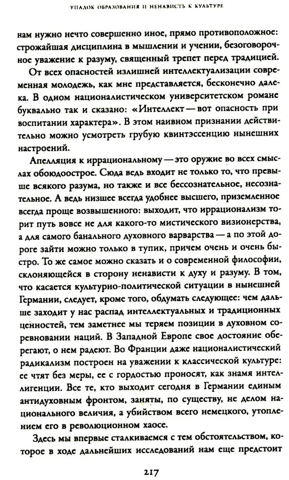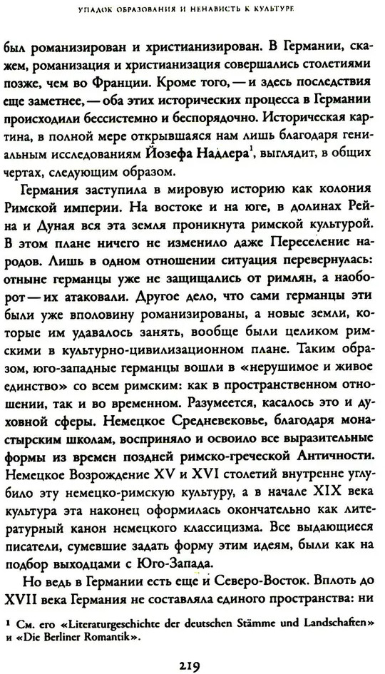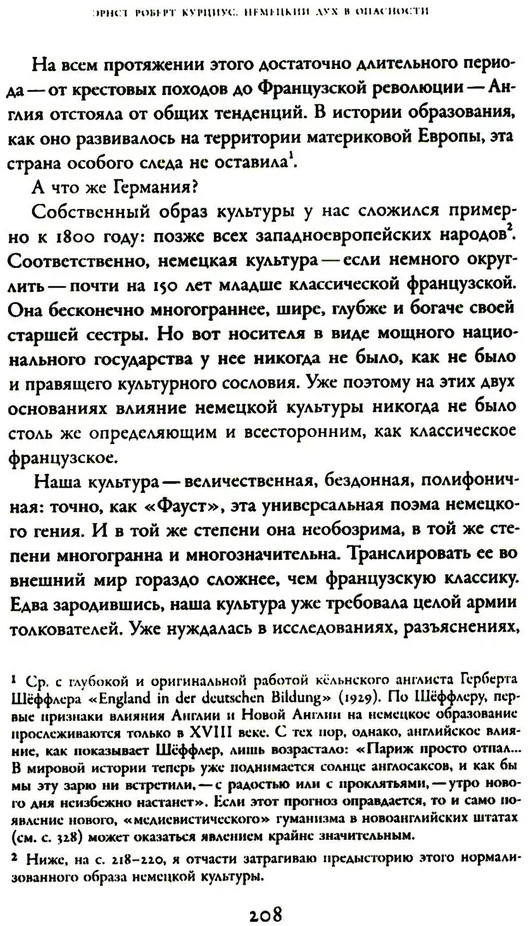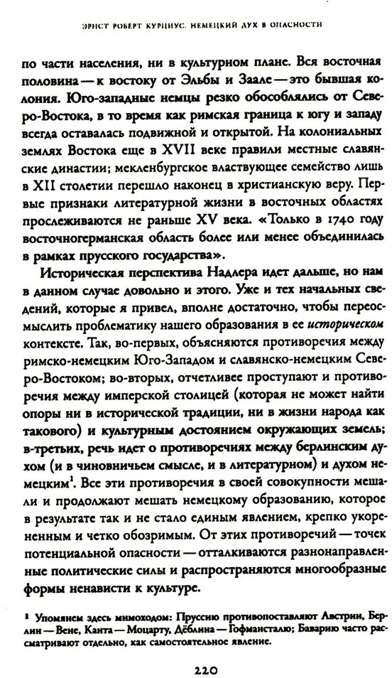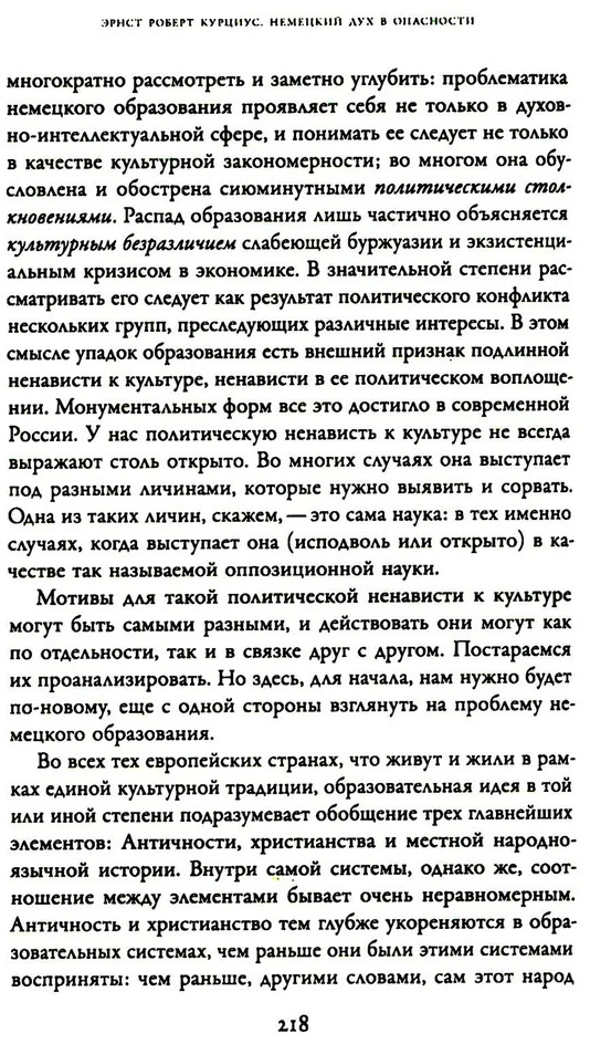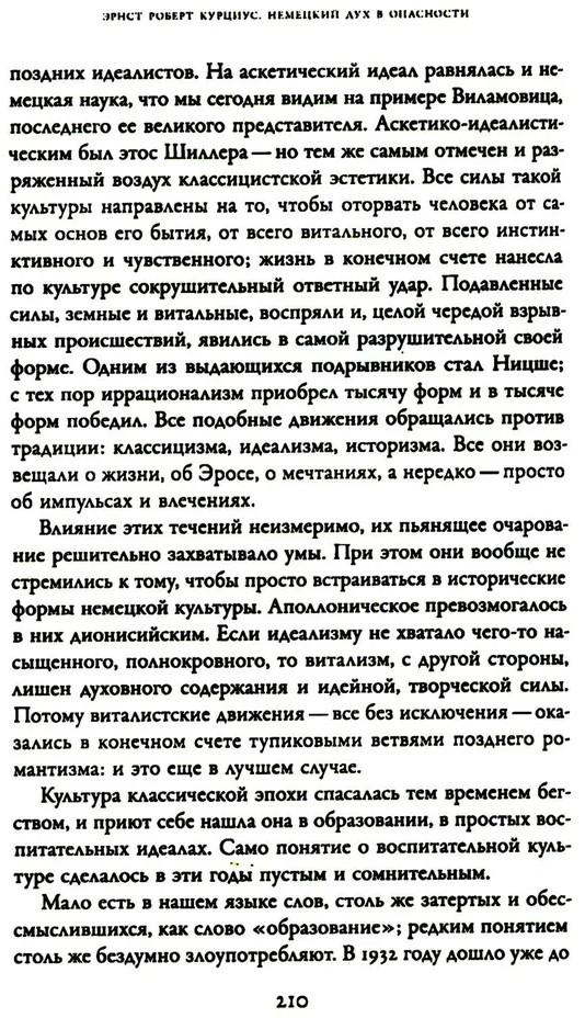 В 1931-19ЗЗ годах немецкий филолог-романист, медиевист и переводчик Эрнст Роберт Курциус на время отходит от чистой науки в поисках гуманистической философской альтернативы торжествующим тоталитарным идеям. Подведение социальных и политических итогов в предчувствии трагических времен подтолкнуло Курциуса к переосмыслению целого ряда культурно-исторических явлений, неизменно сопровождавших его проект глобальной Европы. В 1932. году он публикует своеобразный политический манифест — книгу «Немецкий дух в опасности», где впервые предлагает концепцию «нового гуманизма», призванного, согласно ей, сохранить целостность народного духа в условиях надвигающейся катастрофы и опирающегося на просвещенное Средневековье и идею всеевропейской общности в противовес революционному национализму эпохи. Критически описав общественно-политические, культурные и образовательные тенденции в современной ему* Германии, Курциус стал врагом собственной страны, занятой в то время пересмотром истории и изобретением коллективно переживаемых форм величия. Издание предваряет подробное предисловие Д. Колчигина, куда включены также несколько статей Курциуса и его критиков. |