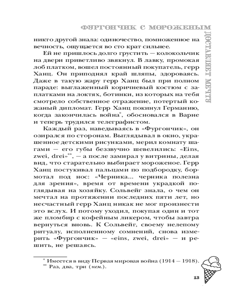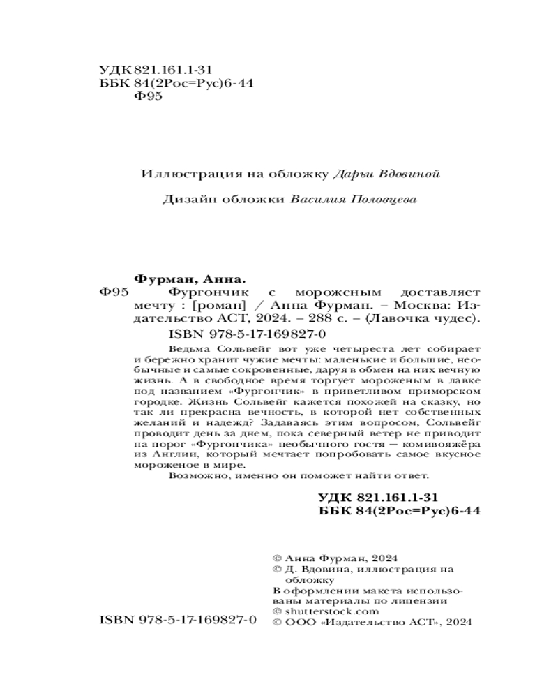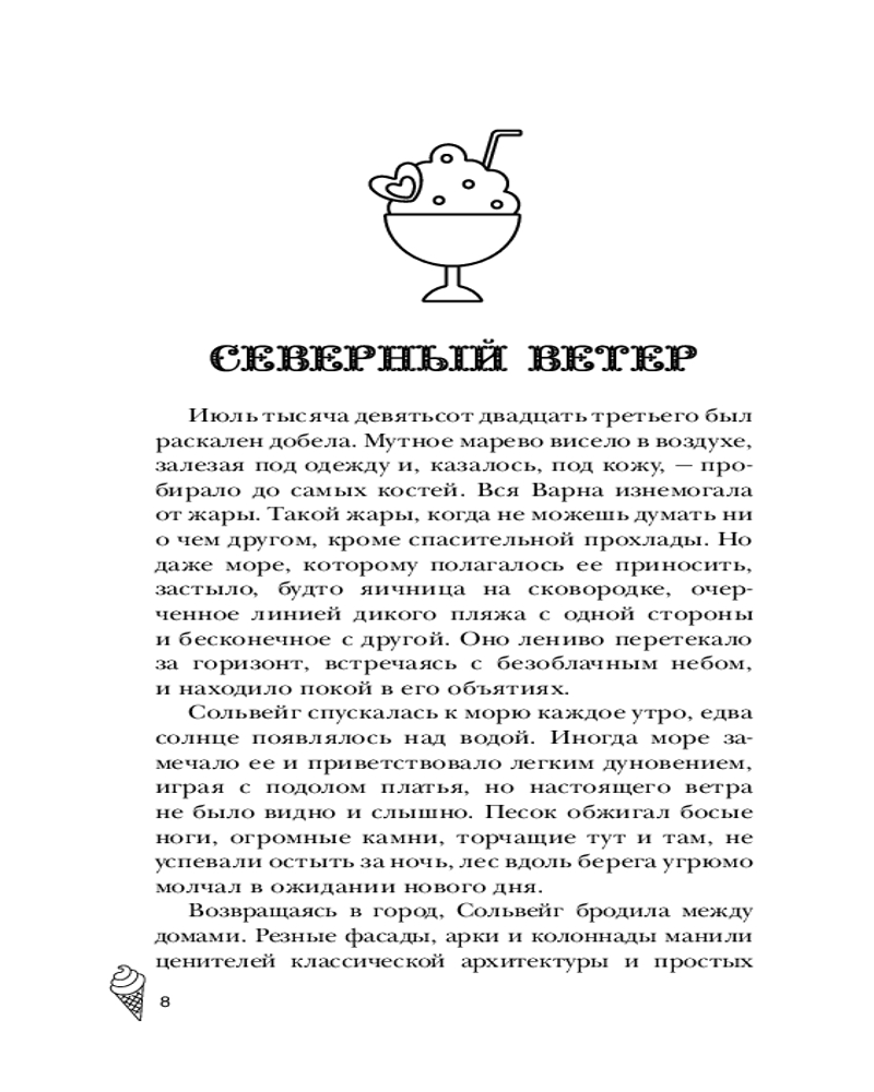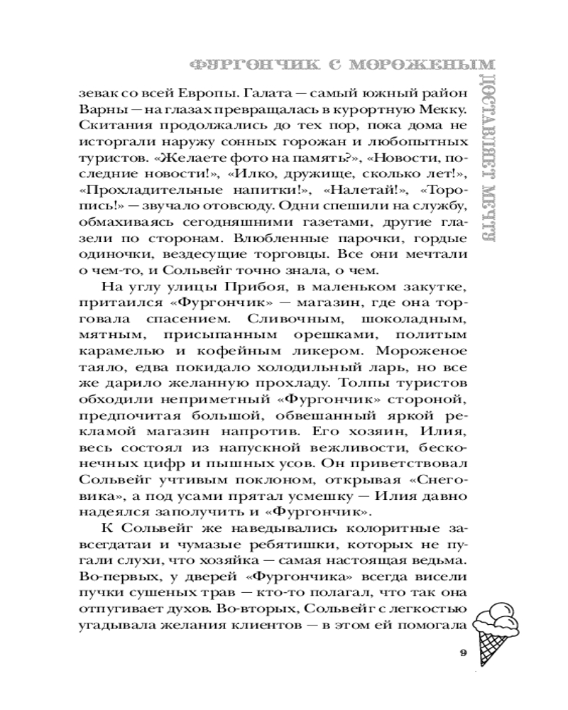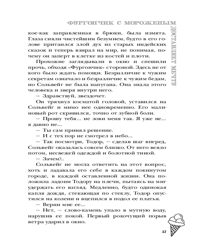 Серия: Лавочка чудес Ведьма Сольвейг вот уже четыреста лет собирает и бережно хранит чужие мечты: маленькие и большие, необычные и самые сокровенные, даруя в обмен на них вечную жизнь. А в свободное время торгует мороженым в лавке под названием «Фургончик» в приветливом приморском городке. Жизнь Сольвейг кажется похожей на сказку, но так ли прекрасна вечность, в которой нет собственных желаний и надежд? Задаваясь этим вопросом, Сольвейг проводит день за днем, пока северный ветер не приносит на порог «Фургончика» необычного гостя — коммивояжера из Англии, который мечтает попробовать самое вкусное мороженое в мире. Возможно, именно он поможет найти ответ. |