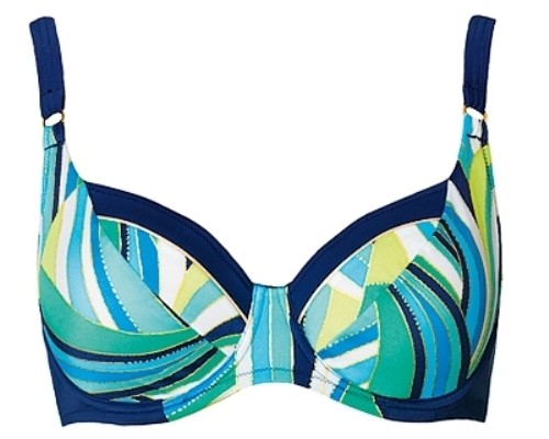 Бюстгальтер купальный из эластичного трикотажного набивного и однотонного полотна. Мягкие чашки на подкладке из эластичного сетчатого полотна. На каркасах. Бретели регулируемой длины. Отделка– золотой кант.