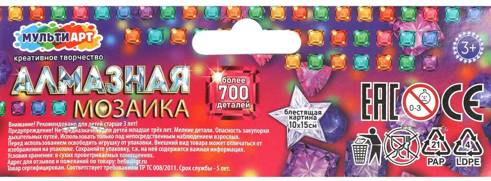 При помощи этого набора маленький художник сможет создать красивую блестящую открытку-мозаику, декорированную сверкающими стразами. Яркую поделку можно подарить близким или использовать для украшения комнаты.