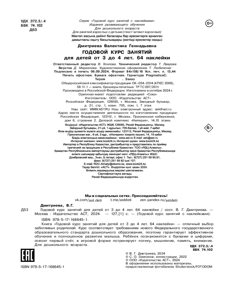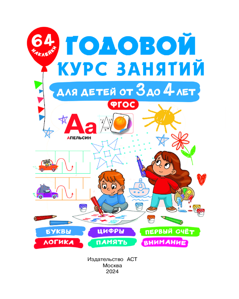 Годовой курс занятий для детей от 3 до 4 лет. 64 наклейкиВалентина Геннадьевна Дмитриева В данный момент этот товар отсутствует в продаже. Возможно, у нас найдется аналогичный или похожий товар здесь. Серия: Годовой курс занятий с наклейками Книга «Годовой курс занятий для детей от 3 до 4 лет. 64 наклейки» — отличный выбор заботливых родителей. Курс соответствует требованиям нового Федерального государственного образовательного стандарта дошкольного образования, поэтому гарантирует эффективное обучение и полноценное развитие малыша. Ребёнок познакомится с буквами и цифрами, освоит первый счёт, в игровой форме потренирует логику, мышление, память, внимание. |