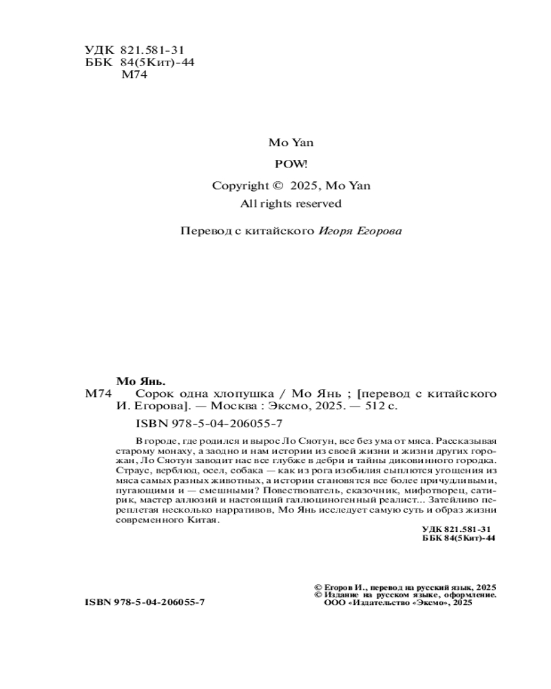 Серия: Loft. Лучшие произведения Мо Яня Повествователь, сказочник, мифотворец, сатирик, мастер аллюзий и настоящий галлюциногенный реалист... Все это — Мо Янь, один из величайших писателей современности, знаменитый китайский романист, который в 2012 году был удостоен Нобелевской премии по литературе. «Сорок одна хлопушка» на русском языке издается впервые и повествует о диковинном китайском городе, в котором все без ума от мяса. Девятнадцатилетний Ло Сяотун рассказывает старому монаху, а заодно и нам, истории из своей жизни и жизней других горожан и чем дальше, тем глубже заводит нас в дебри и тайны этого фантасмагорического городка, который на самом деле является лишь аллегорическим отражением современного Китая. |