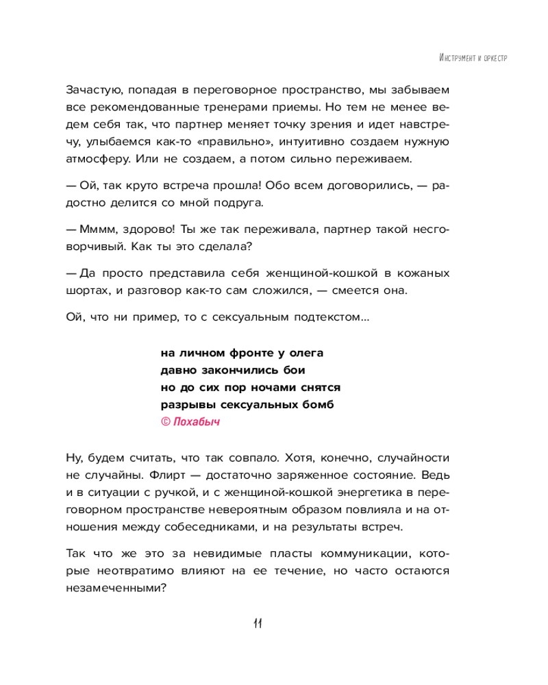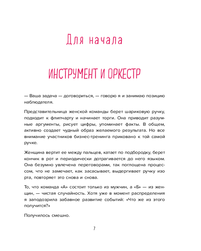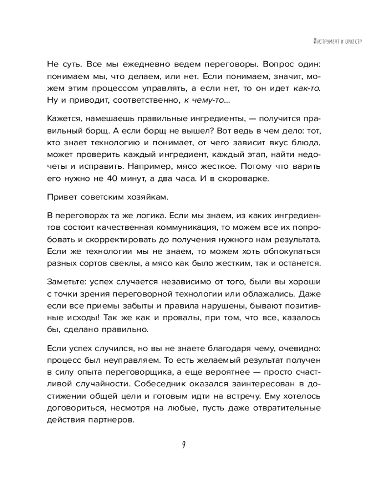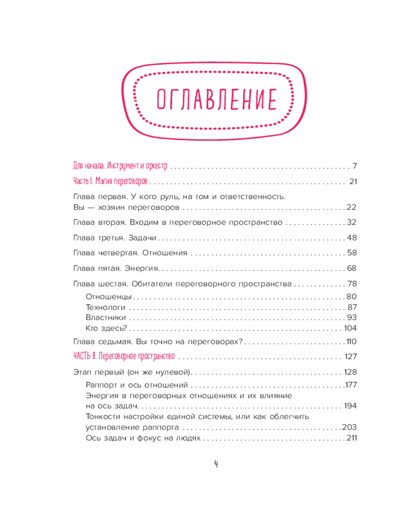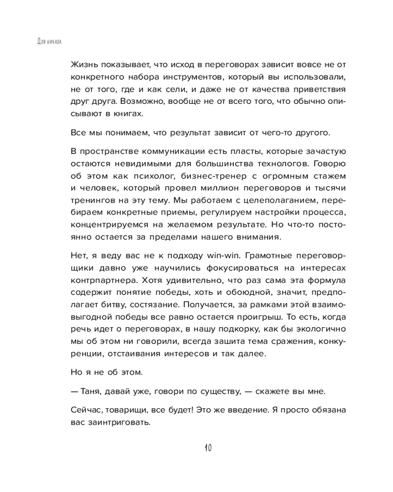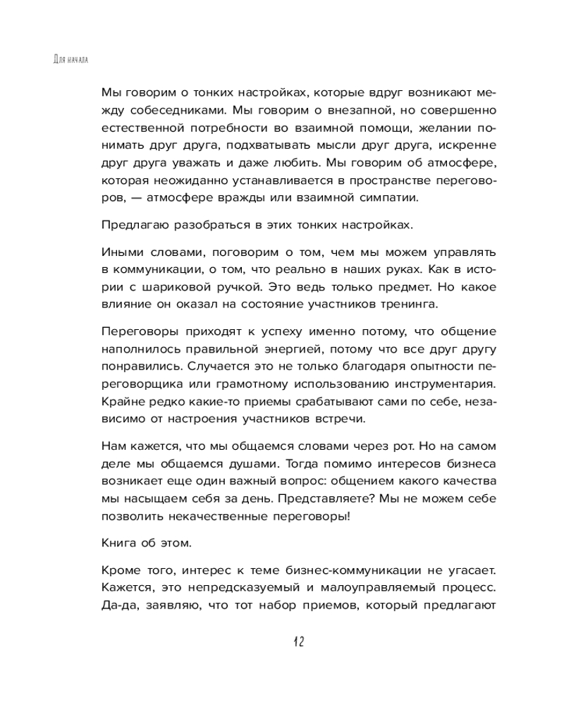 Серия: Искры вдохновения. Книги, которые исполняют желания Не только в овальных кабинетах случаются переговоры. Вы договариваетесь об уборке комнаты с ребенком, о датах отпуска с партнером, о скидке на помидоры с продавцом. И каждый раз вы оказываетесь в трехмерном переговорном пространстве, которое, по Татьяне Мужицкой, состоит из задач, отношений и энергии. Задачи — это цели коммуникации, отношения — стиль взаимодействия участников, энергия — их состояние. И, чтобы коммуникация была результативной, важно поймать баланс по всем трем направлениям. Для этого автор предлагает простую поэтапную технологию. Освоив ее, можно изменить свое отношение к переговорам. Сделать их и эффективными, и интересными. Не зря ведь книга называется «Переговоры по душам». |