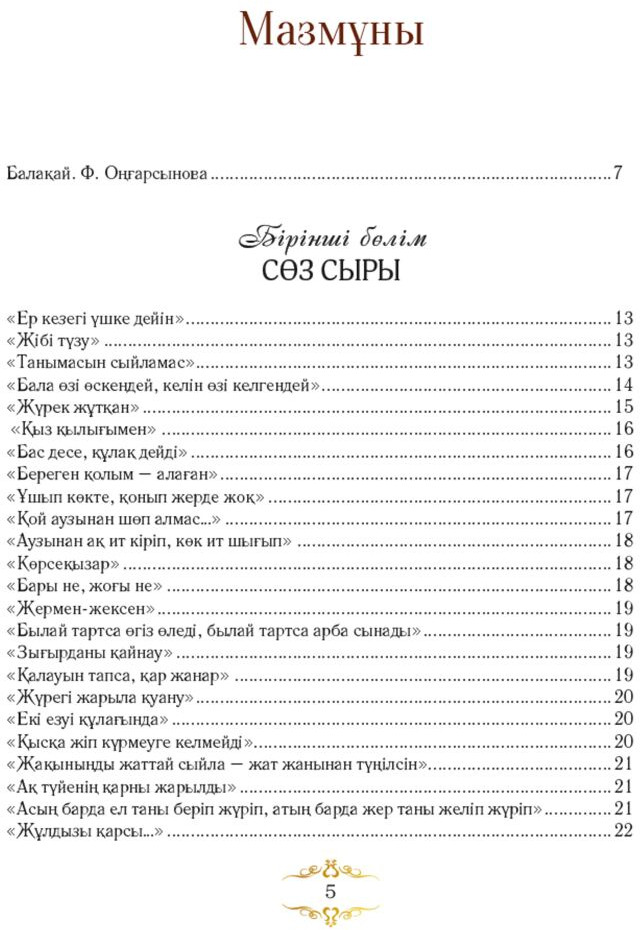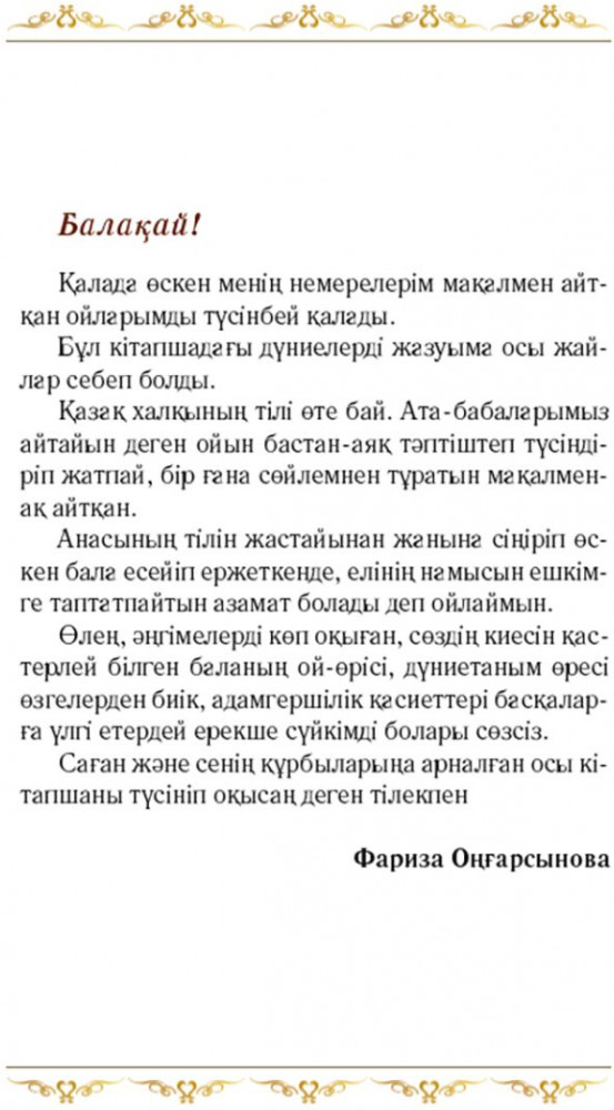 Сөз сырыВ данный момент этот товар отсутствует в продаже. Возможно, у нас найдется аналогичный или похожий товар здесь. Серия: Балаларға базарлық Қазақтың көрнекті ақыны Фариза Оңғарсынова бұл кітабында халқымыздың мақал-мәтелдері мен тұрақты сөз тіркестерінің мағынасын талдап түсіндіреді. Балаларға ұлттық салт-дәстүріміз бен әдет-ғұрпымыз туралы мол мағлұмат береді. |