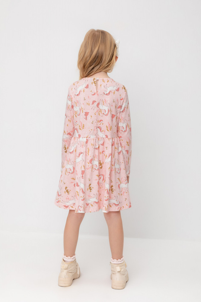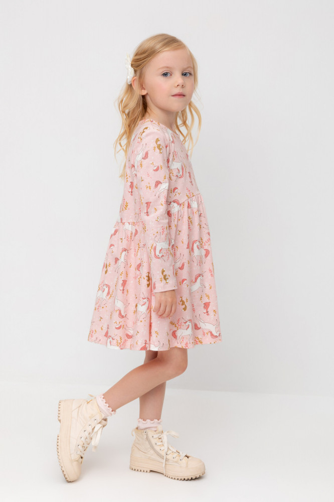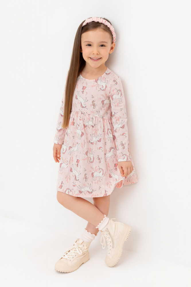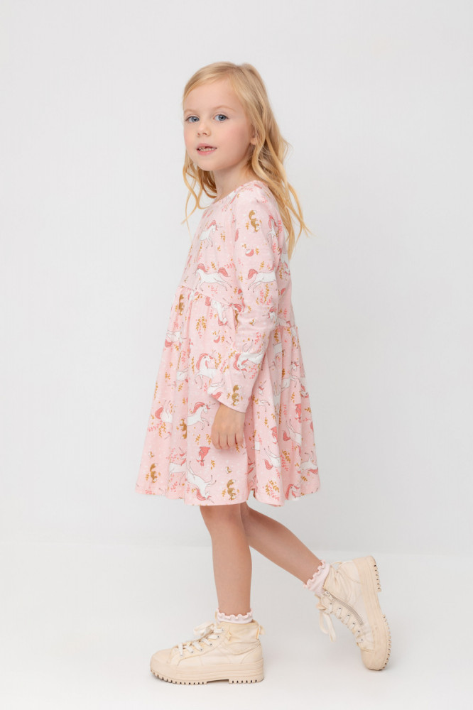 Трикотажное платье для девочки из высококачественного хлопка. Оригинальная набивка выполнена из стойких текстильных гипоаллергенных красителей. Изделие сохраняет цвет и форму после многократных стирок.