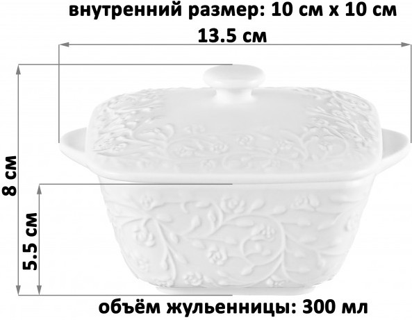 Серия: Веточки-цветочки Жюльенница-кокотница с крышкой выполнена из белого фарфора в классическом дизайне и станет украшением вашей кухни! Посуда украшена рельефным узором в виде изящных веточек с маленькими цветочками. Компактную форму с крышечкой и ручками можно использовать для приготовления жюльена, а также выпекания разнообразных десертов и кондитерских изделий. Маленькая формочка подойдёт для выпечки в духовке или изящной сервировки стола. Готовый кулинарный шедевр можно сразу подавать на стол, используя кокотницу в роли сервировочного блюда. Вам не понадобится отдельная тарелка! Подойдёт для приготовления творожной запеканки, крем-брюле и других порционных блюд. Фарфоровые изделия отличаются от керамики повышенной плотностью. Фарфор не впитывает цвет продуктов и не деформируется от влаги, чему может быть подвержена керамика. |