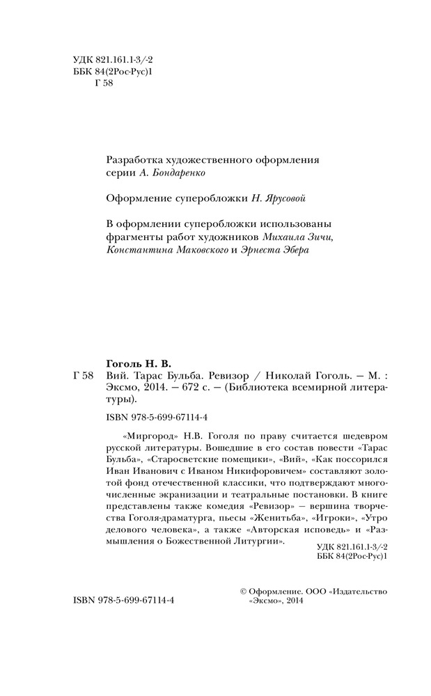 Вий. Тарас Бульба. РевизорВ данный момент этот товар отсутствует в продаже. Возможно, у нас найдется аналогичный или похожий товар здесь. Серия: Библиотека Всемирной Литературы "Миргород" Н.В. Гоголя по праву считается шедевром русской литературы. Вошедшие в его состав повести "Тарас Бульба", "Старосветские помещики". "Вий", "Как поссорился Иван Иванович с Иваном Никифоровичем" составляют золотой фонд отечественной классики, что подтверждают многочисленные экранизации и театральные постановки. В книге представлены также комедия "Ревизор" - вершина творчества Гоголя-драматурга, пьесы "Женитьба", "Игроки", "Утро делового человека", а также "Авторская исповедь" и "Размышления о Божественной Литургии". |