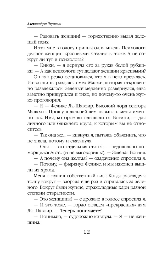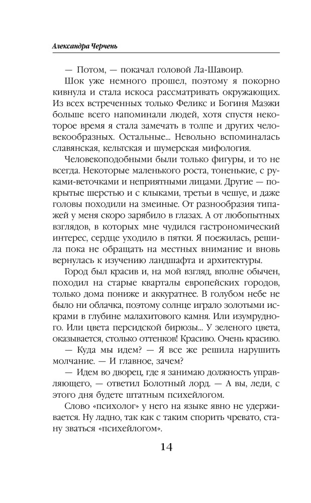 Современная российская писательница Александра Черчень появилась на свет в 1991 году. Первые ее работы читатель мог найти на страницах «Самиздата», где они быстро «обросли» восторженными отзывами. Вскоре девушка выпустила сразу несколько серий, среди которых лучшие книги, по мнению ее поклонников, – это «Факультет интриг и пакостей», «Счастливый брак по-драконьи», серия «Психологические работы с обитателями болота». На литературном поприще Александра дебютировала в 2012 году с романом... |