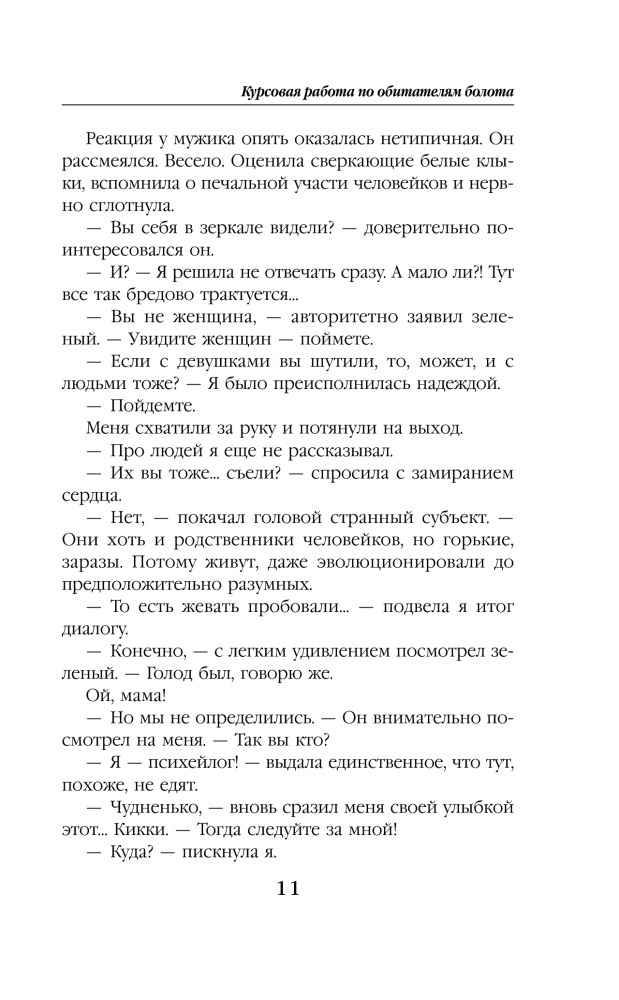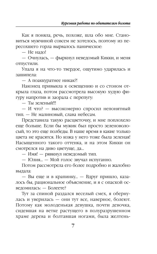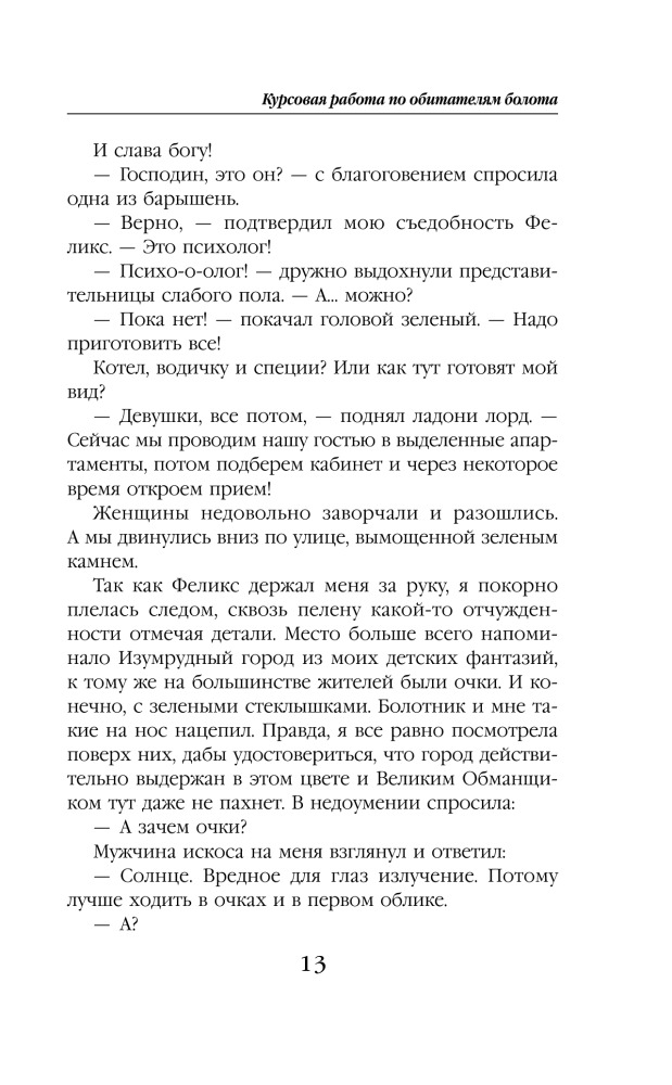 Курсовая работа по обитателям болотаВ данный момент этот товар отсутствует в продаже. Возможно, у нас найдется аналогичный или похожий товар здесь. Серия: Колдовские миры Если вас перенесли в другой, с виду прекрасный мир спешите радоваться. Даже если предлагают работу в Изумрудном городе, во дворце и прямо по специальности. Ибо кто знает, какие там порядки? Особенно если население сплошь наги, разумные пауки, мегаморфы-ниоры. привидения и много кто еще. Поговаривают, что из редких зверей стилистов там парят декокты, а последние популяции человейков доживают свой век в зоопарках. Возникает вопрос: не съедят ли там на завтрак симпатичного психолога с неполным высшим?! Тем более что перед тем самым психологом, Юлей Аристовой, стоит неподъемная задача: сделать местных пупырчатых, чешуйчатых, хвостатых дам ужасно привлекательными, ну, или так повысить их самооценку, чтобы не пасовали перед эльфийской делегацией. А параллельно - разобраться с двумя очень влиятельными персонами, которым вдруг понадобилась помощь специалиста: эльфом, Хозяином Медной горы, и кикимором, внуком богини, главным советником и наследником правителя Гудвина |