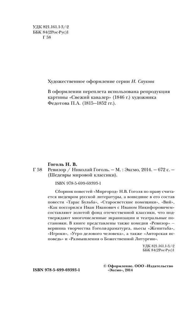 РевизорВ данный момент этот товар отсутствует в продаже. Возможно, у нас найдется аналогичный или похожий товар здесь. Серия: Шедевры мировой классики Сборник повестей "Миргород" Н.В.Гоголя по праву считается шедевром русской литературы, а вошедшие в его состав повести "Тарас Бульба", "Старосветские помещики". "Вий", "Как поссорился Иван Иванович с Иваном Никифоровичем" составляют золотой фонд отечественной классики, что подтверждают многочисленные экранизации и театральные постановки. В книге представлены также комедия "Ревизор" - вершина творчества Гоголя-драматурга, пьесы "Женитьба", "Игроки", "Утро делового человека", а также "Авторская исповедь" и "Размышления о Божественной Литургии". |