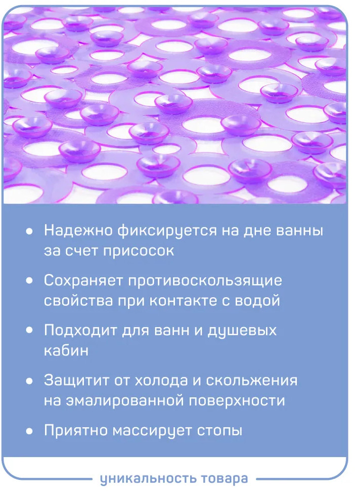 Противоскользящий ПВХ-коврик для душевой и ванны с легким массажным эффектом. Размер позволяет разместить его в любой чаше ванной или душевой кабине. Присоски на обратной стороне резинового коврика в ванную обеспечат надежную фиксацию на поверхности и уберегут от падений детей, пожилых людей и взрослых. Легкий массажный эффект, создаваемый поверхностью антискользящего ковра взбодрит утром и расслабит уставшие ноги после рабочего дня вечером.