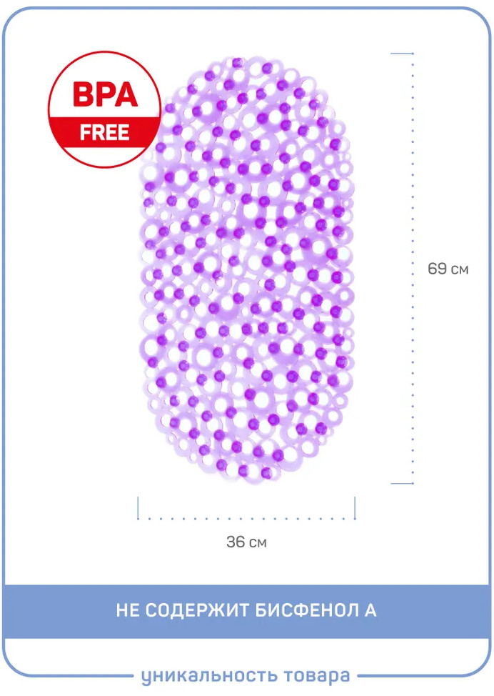 Исполнение изделия позволит воде уходить, просушить мягкий коврик для душа и поверхность ванной после использования не составит труда. ПВХ материал коврика для купания не токсичен, легко моется и не взаимодействует с косметическими средствами. Для лучшей фиксации рекомендуется предварительно намочить поверхность и после этого крепить изделие на присосках.