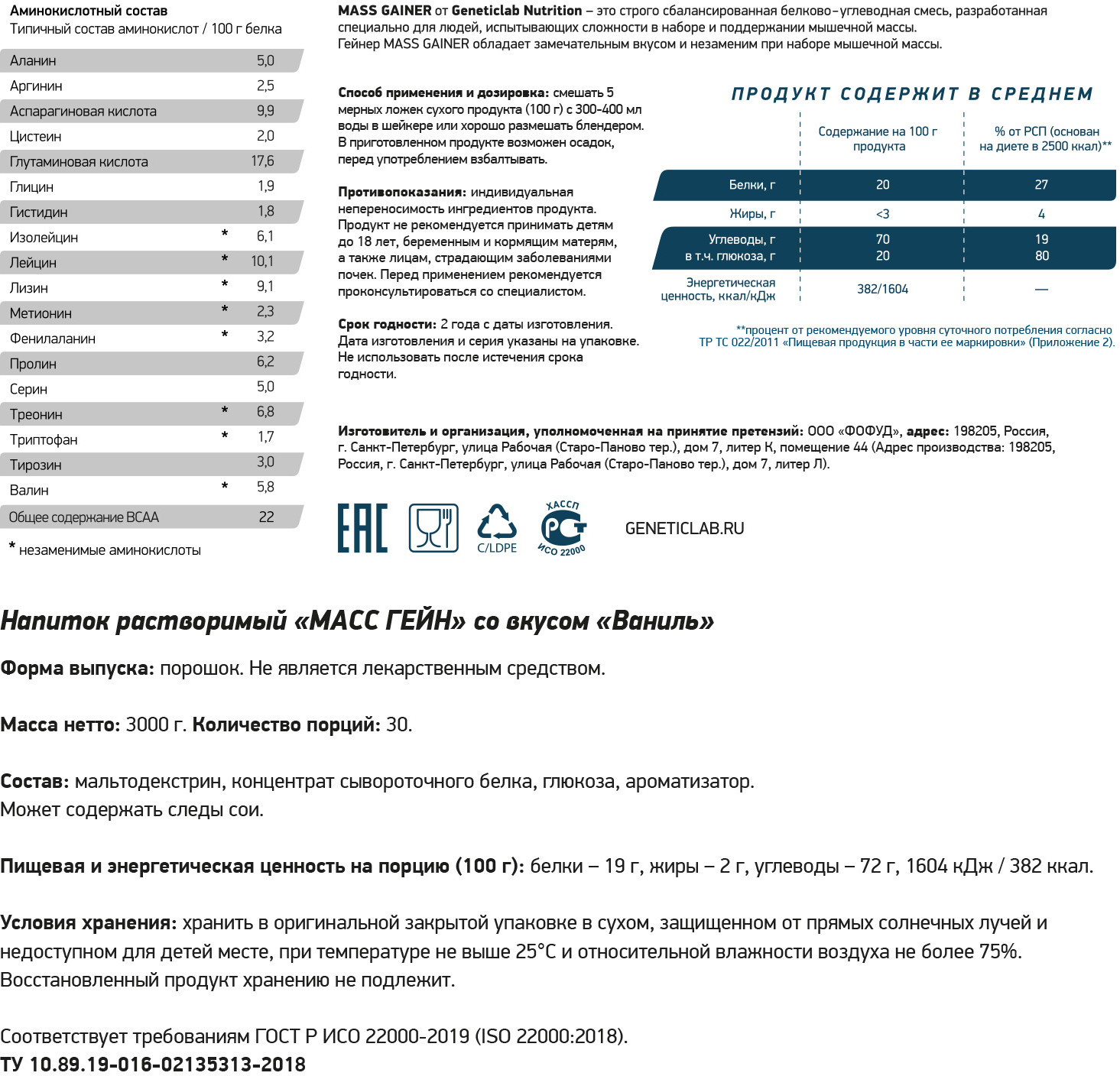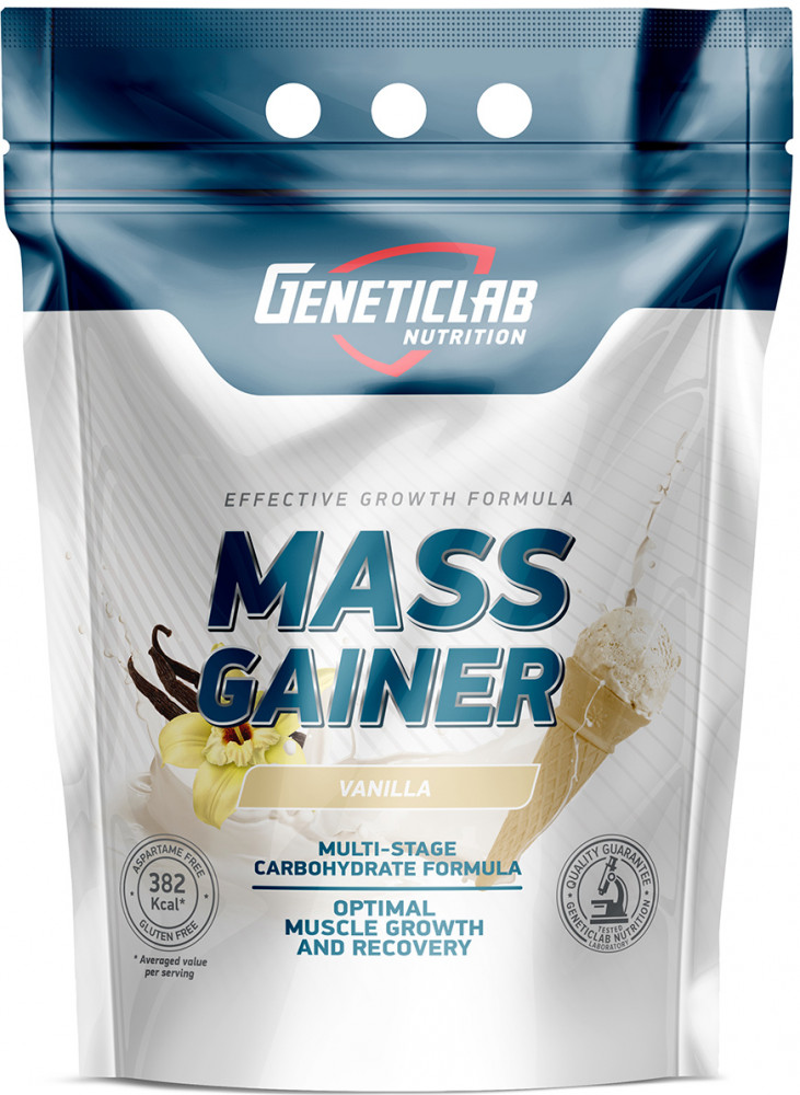 Высококалорийный гейнер Mass Gainer от Geneticlab предназначен для питания профессиональных спортсменов, а также для тех, кто набирает массу. Соотношение углеводов к белку в нем равно 3:1. С каждой порцией вы обеспечите потребность организма в 20 граммах белка и 72 граммах углеводов (в зависимости от выбранного вкуса данные показатели могут отличаться, см. на упаковке). Белок необходим для поддержания процессов по построению и наращиванию мышечной массы, углеводы — для восстановления гликогеновых запасов и энергетических потребностей. Вместе они поддержат оптимальное восстановление организма. Белковая составляющая — это сывороточный концентрат, углеводная часть — это мальтодекстрин. Потребляя данный гейнер, вы поддержите чувство сытости длительное время.