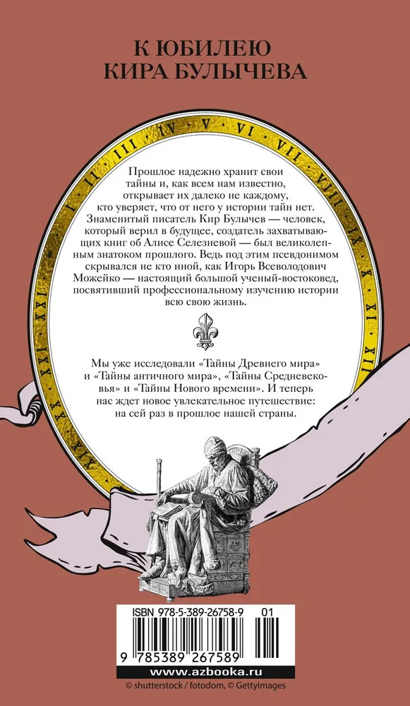 Прошлое надежно хранит свои тайны и, как всем нам известно, открывает их далеко не каждому, кто уверяет, что от него у истории тайн нет. Знаменитый писатель Кир Булычев — человек, который верил в будущее, создатель захватывающих книг об Алисе Селезневой — был великолепным знатоком прошлого. Ведь под этим псевдонимом скрывался не кто иной, как Игорь Всеволодович Можейко — настоящий большой ученый-востоковед, посвятивший профессиональному изучению истории всю свою жизнь.