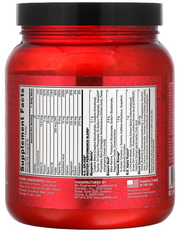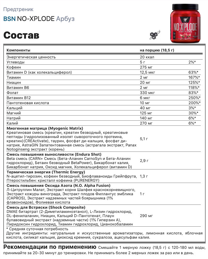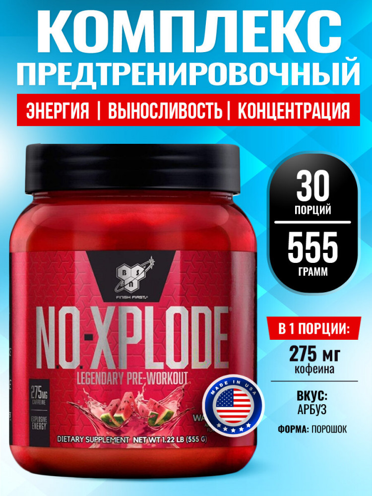 NO-Xplode 3.0 — новая формула предтренировочного комплекса от компании BSN. В отличие от предыдущей версии, продукт отличается более высокой концентрацией активных компонентов при уменьшенном объеме порции, характеризуется улучшенным действием на фокусировку и концентрацию, но позволяет избежать гиперстимуляции ЦНС и тремора. Благодаря специальному газированию порошковой смеси повышается скорость усвоения BSN NO-Xplode 3.3, и он начинает работать спустя 30-40 минут после попадания в организм. NO-Xplode 3.0 рекомендуется спортсменам, которые хотят повысить интенсивность тренировок и побить собственные спортивные рекорды. Он обеспечит идеальное сочетание физической энергии, выносливости, мышечной силы и максимальной концентрации, что позволит повысить производительность каждой тренировки.