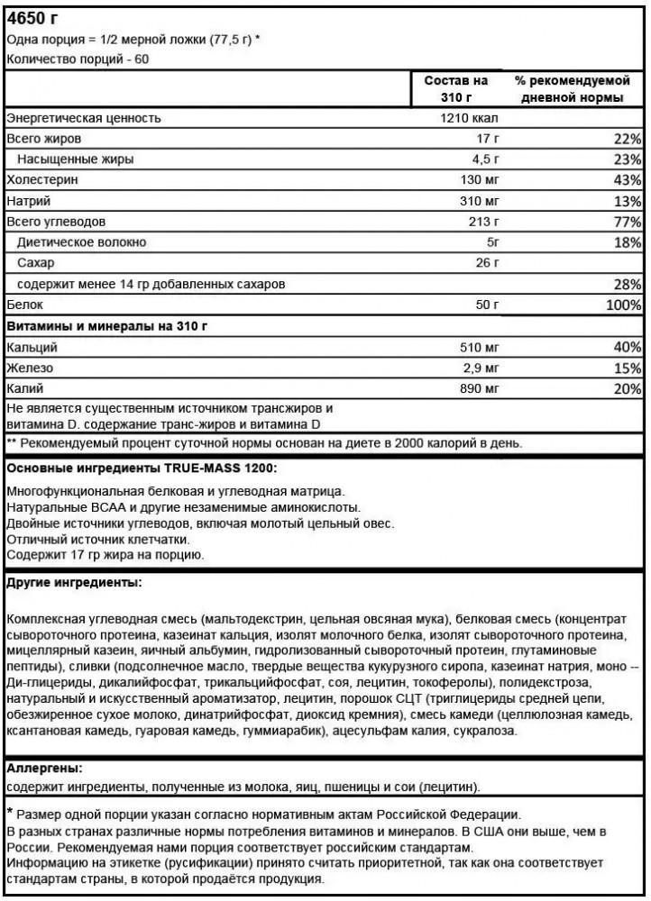 Комплексная углеводная смесь (мальтодекстрин, цельная овсяная мука), белковая смесь (концентрат сывороточного протеина, казеинат кальция, изолят молочного белка, изолят сывороточного протеина, мицеллярный казеин, яичный альбумин, гидролизованный сывороточный протеин, глутаминовые пептиды), сливки (подсолнечное масло, твердые вещества кукурузного сиропа, казеинат натрия, моно- ди-глицериды, дикалийфосфат, трикальцийфосфат, соя, лецитин, токоферолы), полидекстроза, натуральный и искусственный ароматизатор, лецитин, порошок СЦТ (триглицериды средней цепи, обезжиренное сухое молоко, динатрийфосфат, диоксид кремния), смесь камеди (целлюлозная камедь, ксантановая камедь, гуаровая камедь, гуммиарабик), ацесульфам калия, сукралоза. Содержит ингредиенты, полученные из молока, яиц, пшеницы и сои (лецитин).