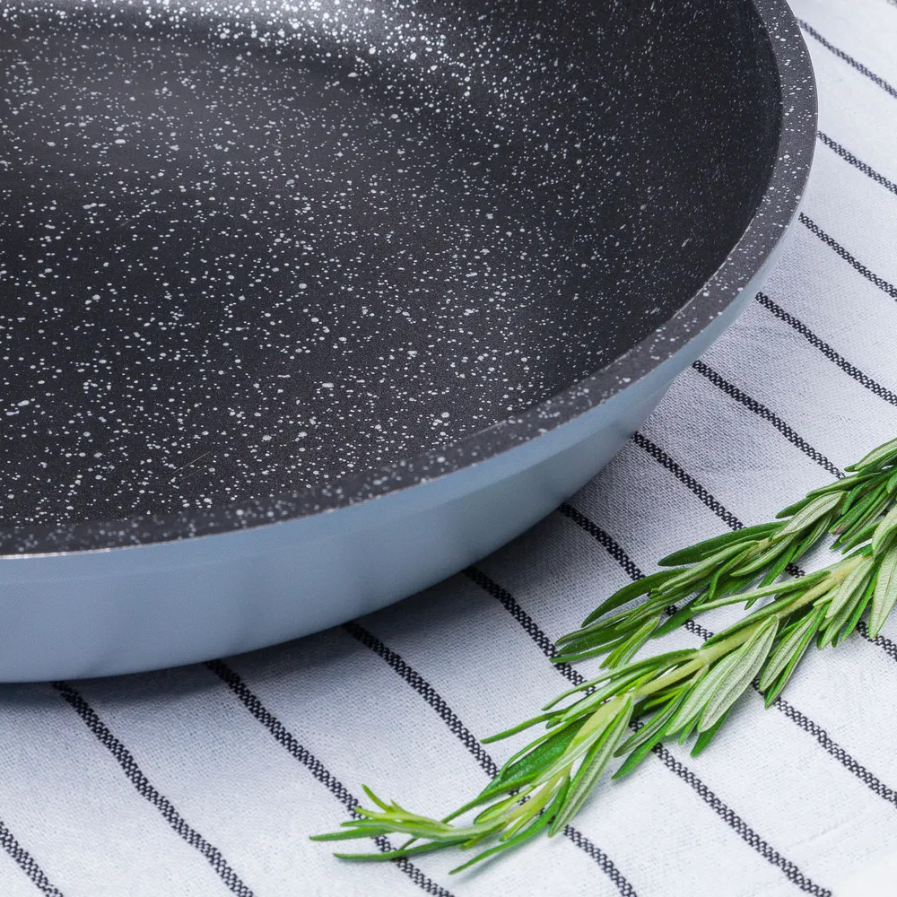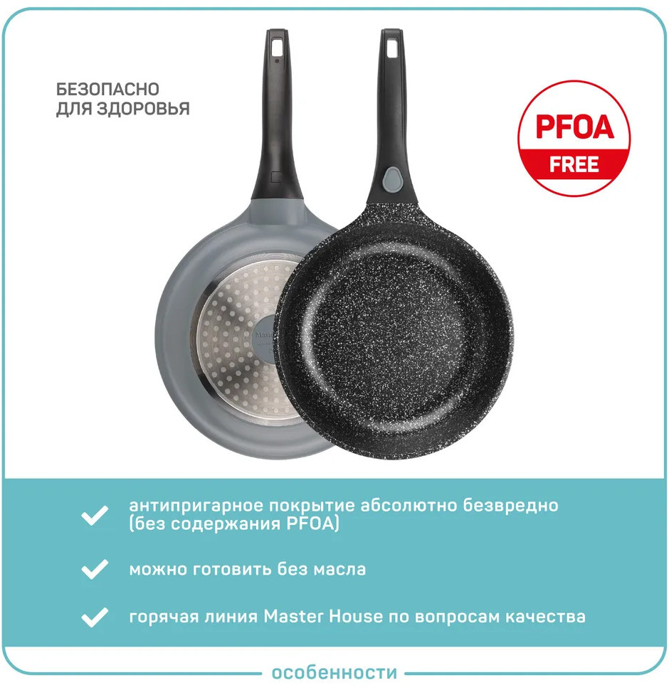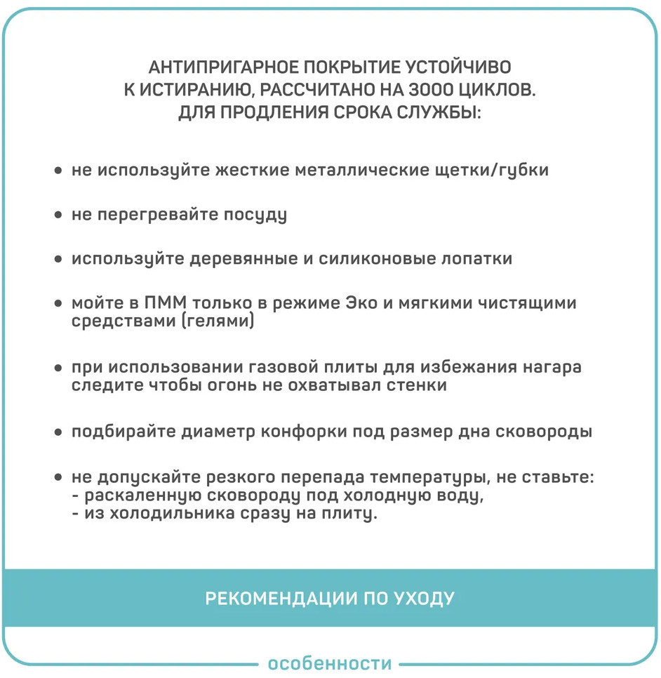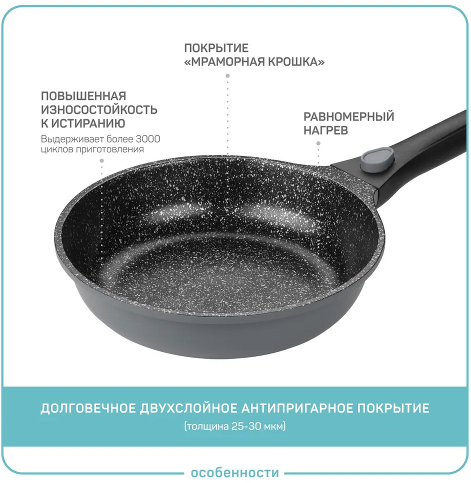 • усиленное антипригарное покрытие — долговечное двухслойное антипригарное усиленное покрытие стандарта Greblon C2 и вида «Мраморная крошка» без вредных веществ. Максимально экологичное, не содержит вредных кислот (PFOA). Выдерживает до 3000 циклов готовки;