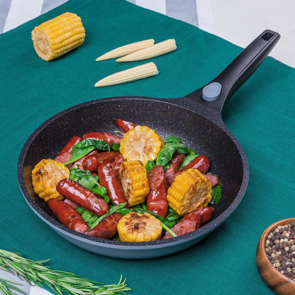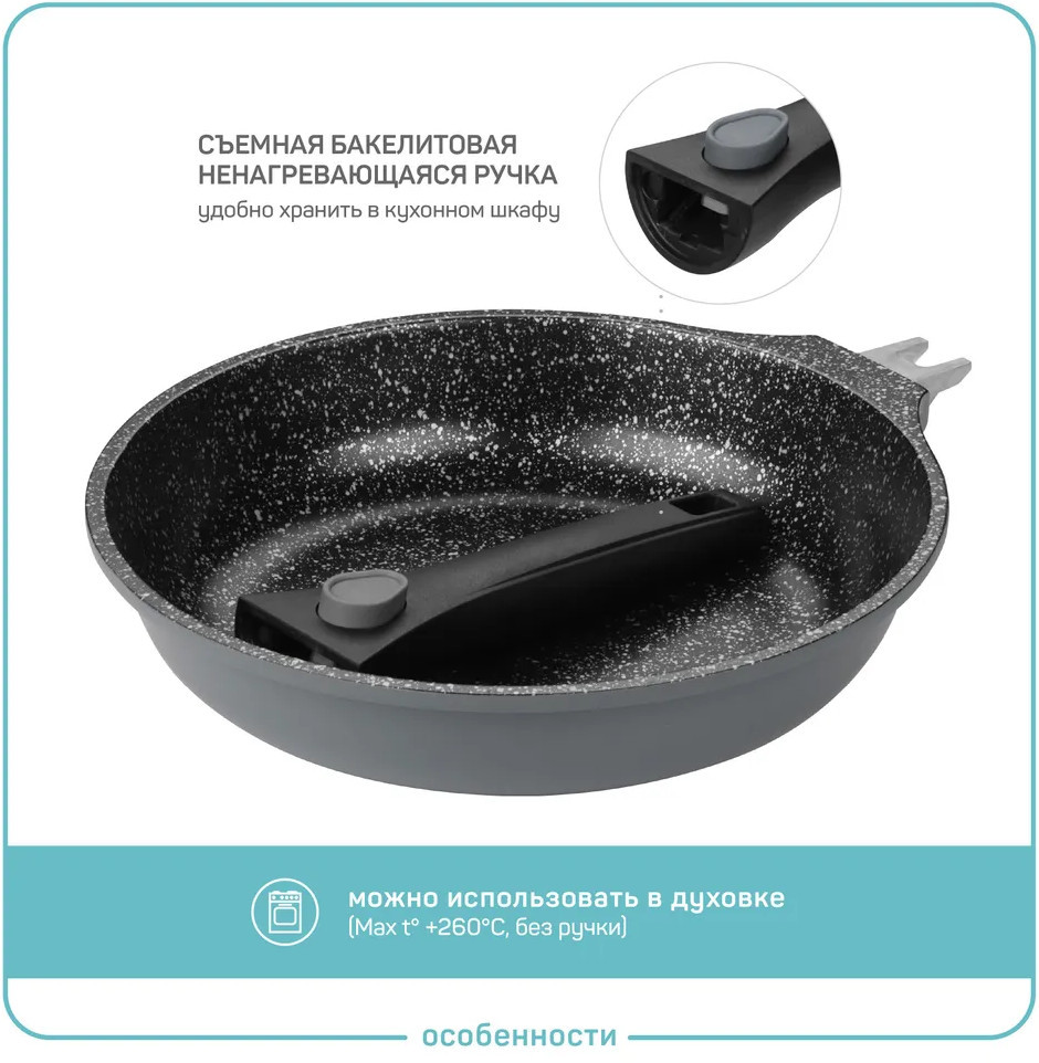Универсальная сковорода из литого алюминия «Шеф Леоне» с антипригарным покрытием Greblon C2 и съемной ручкой.