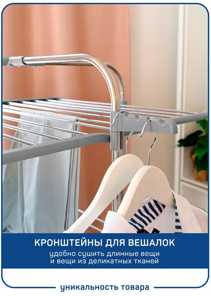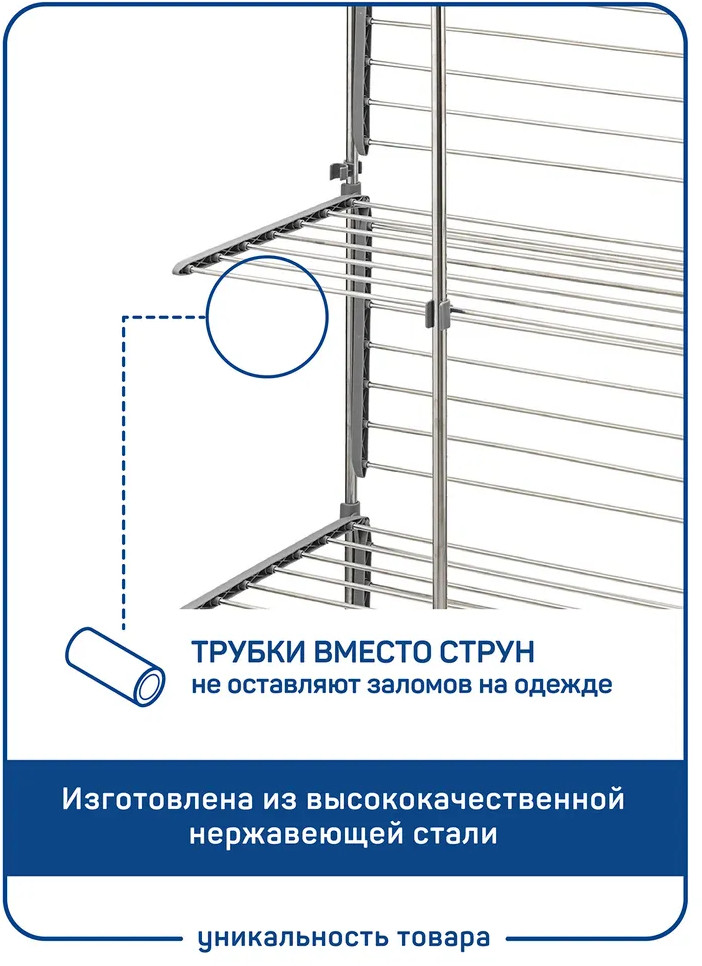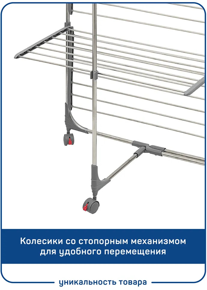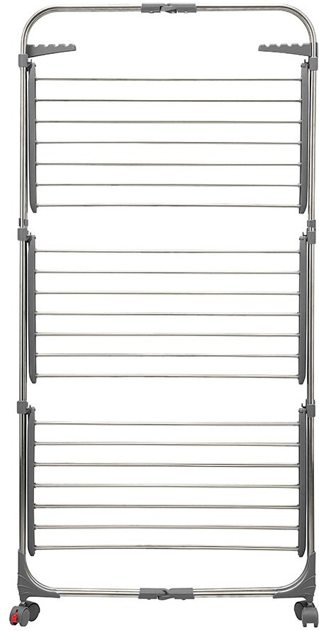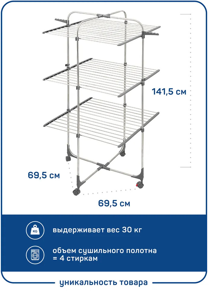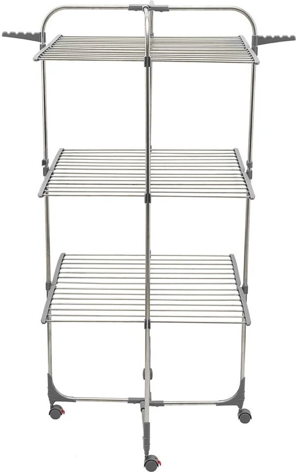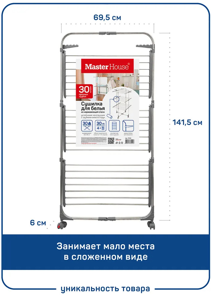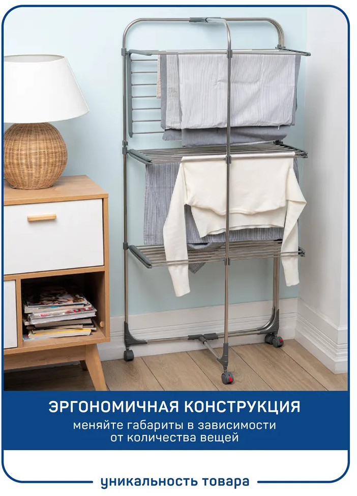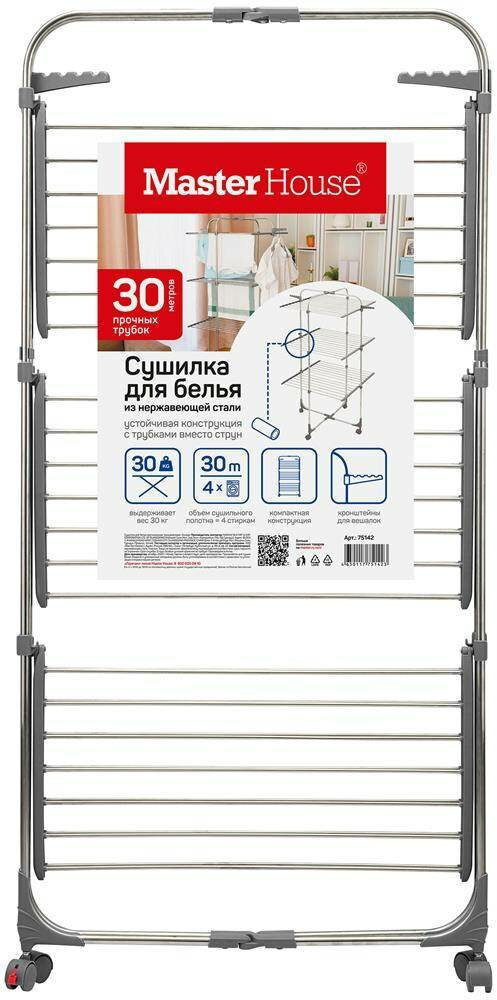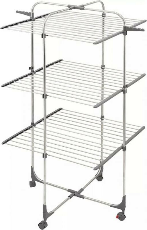 Master House Сушилка для белья вертикальная трехуровневая «Эннеди»В данный момент этот товар отсутствует в продаже. Возможно, у нас найдется аналогичный или похожий товар здесь. Вертикальная напольная сушилка на колесиках. Сушилка для одежды имеет три уровня, вмещает полную загрузку четырех циклов стиральной машины, выдерживает вес до 30 кг. При этом вертикальная сушилка в разложенном виде занимает меньше половины квадратного метра пола. Вместо струн сушильное полотно изготовлено из трубок диаметром 6 мм, которые не оставляют следов на высушенной одежде. Сушилка для белья изготовлена из нержавеющей стали и высококачественной пластмассы. Прочные колесики со стопорами позволяют легко передвигать сушилку вместе с бельем и фиксировать ее на месте. Специальные кронштейны позволяют сушить одежду на плечиках. Раскладку сушилки-трансформера можно менять: сушильное полотно можно раскрыть на две стороны, сушилку можно приставить к стене и использовать для сушки половину сушильного полотна. Высота сушилки для белья Эннеди позволяет сушить постельное белье, платья, длинные юбки и брюки — расстояние между ярусами 40 см. Для сушки особенно длинных вещей часть ярусов можно убрать. |