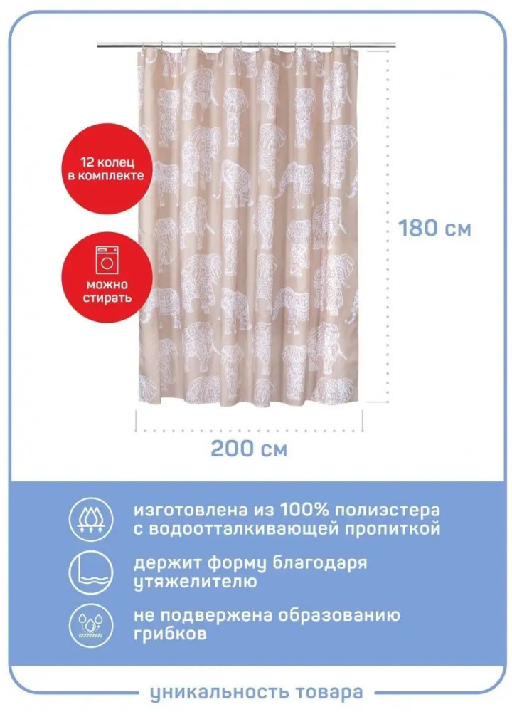 💳 Оплатить за товар можно при получении 🇰🇿 Есть бесплатная доставка по Казахстану от 1 дня 🎁 Копите бонусы с каждой покупки Тканевая бежевая шторка для ванной с белым рисунком 200×180см (увеличенная ширина 200, 180 высота). Прозрачные люверсы и 12 колец в комплекте — пластиковая фурнитура не ржавеет и не портит шторку. Полиэстер — полимерный материал со структурой плетения. Его можно стирать в стиральной машине и гладить при низких температурах. У аксессуара есть утяжелитель. Шире, чем занавески 180×180, поэтому подходит для большего количества помещений. Оптимальный размер водоотталкивающего и водонепроницаемого текстильного барьера, отдаляющего зону душа от общей площади комнаты. Не токсична, с пропиткой от плесени, делает ванную сухой, чистой и нарядной. Занавес держит форму, не липнет, красиво ложится складками или струится ровным полотном. Ткань шторы в ванную плотная по плетению. Декор спокойный — принт белые слоны на бежевом. |