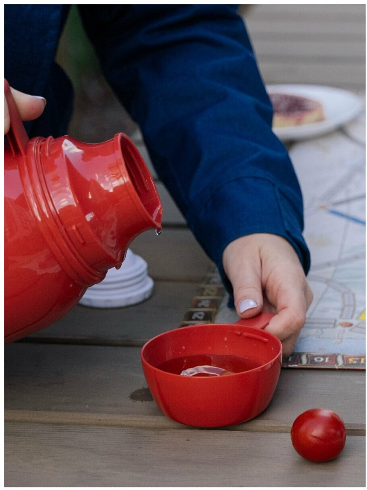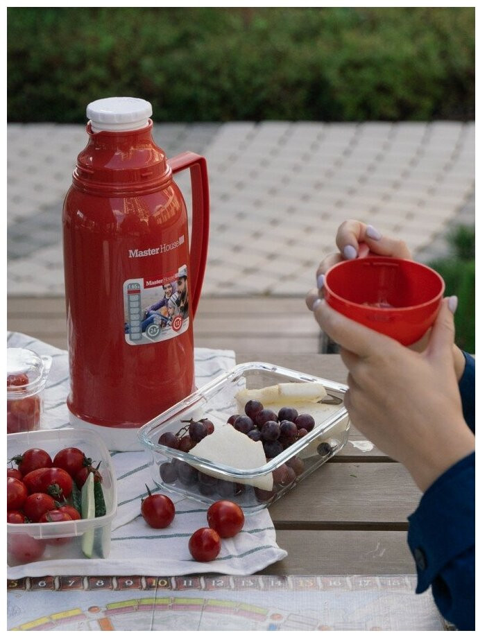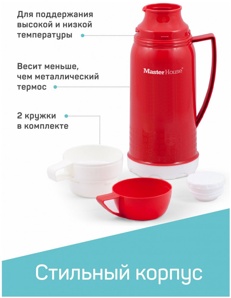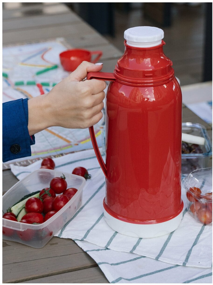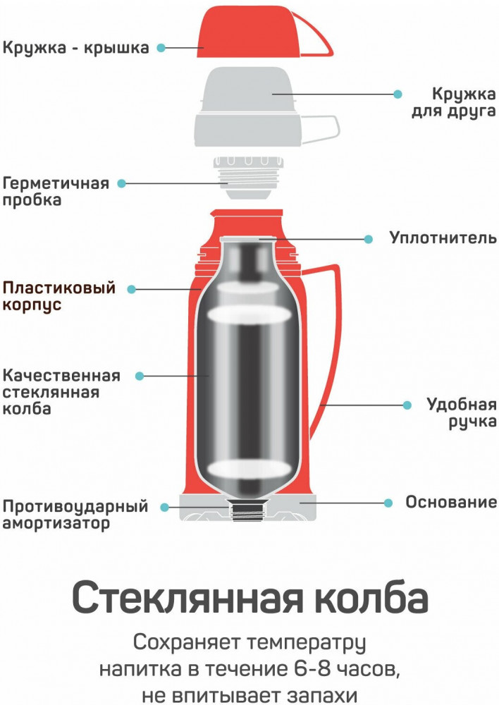 Термос для чая с качественной стеклянной колбой. Две кружки в комплекте. Качественная стеклянная колба не впитывает запахи. Легкость изделия: весит меньше, чем металлический термос. Температура напитка сохраняется в течение 6-8 часов в зависимости от температуры воздуха. Легкий и прочный — можно брать с собой в любые поездки. Две кружки в комплекте позволяют поделиться теплым питьем с близкими. Колба из стекла экологична и безопасна для здоровья, вода в ней не приобретает лишних привкусов. Вес у пластикового термокувшина меньше, чем у металлического вакуумного аналога. Состоит из внешнего корпуса, колбы с противоударным амортизатором в основании, уплотнителя и герметичной пробки без клапана. Узкое горлышко с носиком, как у кувшина, позволит бережно налить чай, кофе, травяной напиток по кружкам, не пролив ни капли, сохранив тепло. Можно брать на работу в офис, в тренажерный зал для занятий спортом. Такая термопосуда будет полезна на рыбалке или охоте, спортивной велопрогулке, на походной кухне, в поездке на дачу, для активного отдыха на природе, пикника, в туристическом походе, рыболовном лагере, путешествии на автомобиле.