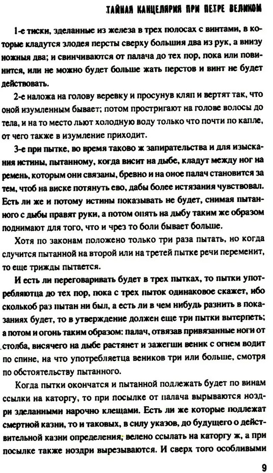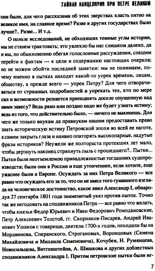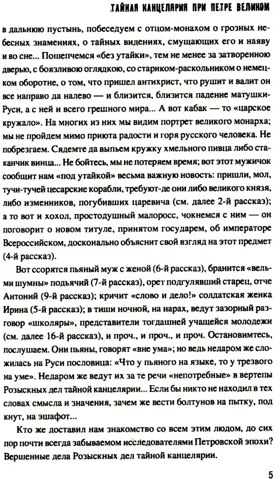 Серия: История Отечества Книга русского историка, журналиста и общественного деятеля М. И. Семевского (1837–1892) рассказывает о непростом и во многом не до конца исследованном становлении и деятельности одной из первых спецслужб Российской империи, органе политического сыска и суда в России в XVIII в. — Тайной канцелярии. Созданная первоначально как временный орган для расследования дела царевича Алексея Петровича и его матери Е.Ф. Лопухиной, она стала заниматься делами об оскорблениях государя и покушениях на его жизнь и здоровье, о государственной измене, раскольниках, о взяточничестве и казнокрадстве. Яркие, эмоционально написанные очерки созданы на основе архивных материалов и разворачивают перед читателем впечатляющую картину русской жизни эпохи Петровских реформ. |