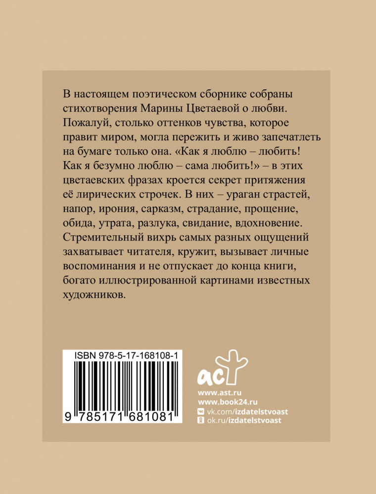 Серия: Мировая поэзия. Подарочное издание с иллюстрациями В настоящем поэтическом сборнике собраны стихотворения Марины Цветаевой о любви. Пожалуй, столько оттенков чувства, которое правит миром, могла пережить и ярко запечатлеть на бумаге только она. «Как я люблю — любить! Как я безумно люблю — сама любить!» — в этих цветаевских фразах кроется секрет притяжения ее лирических строчек. В них — ураган страстей, напор, ирония, сарказм, страдание, прощение, обида, утрата, разлука, свидание, вдохновение. Стремительный вихрь самых разных ощущений захватывает читателя, кружит, вызывает личные воспоминания и не отпускает до конца книги, богато иллюстрированной картинами известных художников. |