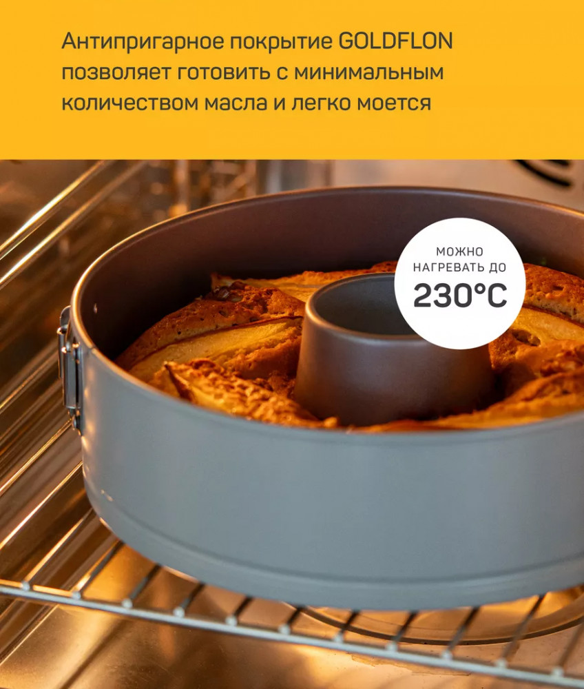 В данный момент этот товар отсутствует в продаже. Возможно, у нас найдется аналогичный или похожий товар здесь. Набор форм для выпечки: разъемная форма 26 см со съемным дном, съемная вставка для фигурного кекса-кольца Саварен. Изготовленная из прочного и высококачественного материала, металлическая разъемная форма обладает отличной прочностью и долговечностью. Она не деформируется под воздействием высоких температур, что позволяет безопасно использовать ее в духовке до 230 градусов. Благодаря антипригарному покрытию Goldflon, выпечка легко отделяется от стенок блюда, что облегчает процесс извлечения готового изделия.