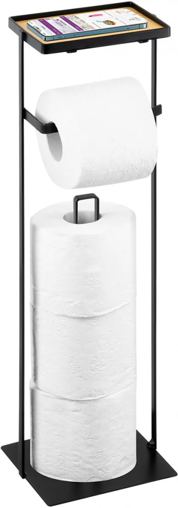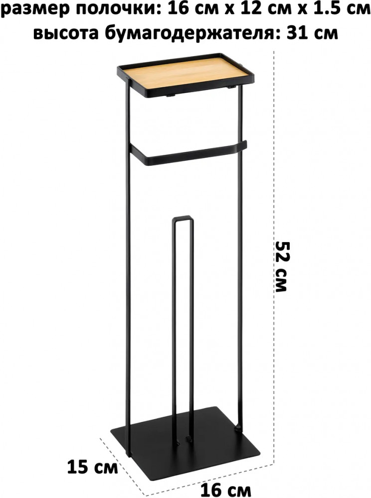 Подставка для туалетной бумаги 16×15×52 см выполнена из металла, имеет бамбуковую полку. Благодаря своей компактности она создаст комфорт даже в небольшом пространстве и станет украшением интерьера. Напольный держатель представляет собой конструкцию, в составе которой есть кронштейн для туалетной бумаги, полочка размером 16×12×1,5 см и вертикальный бумагодержатель для запасных рулонов высотой 31 см (умещается до 3 штук). Выполнен в универсальном дизайне.