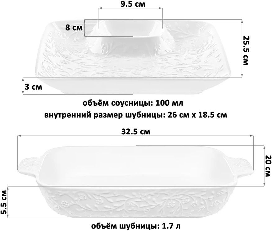 Серия: Веточки-цветочки Набор Elan Gallery «Веточки-цветочки» состоит из двух предметов и выполнен из белого фарфора в классическом стиле. Посуда серии украшена рельефным узором в виде изящных веточек с маленькими цветочками. Соусница объёмом 100 мл является неотделимой частью сервировочного блюда. Набор поможет создать идеальную атмосферу для приема гостей или романтического ужина дома. Прямоугольное блюдо с соусницей подойдёт для подачи суши, ролл и шашлыка, так как вам не придётся искать отдельную ёмкость для соуса. Шубницу можно использовать для подачи сельди под шубой, салатов или плова. |