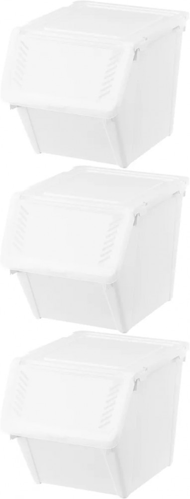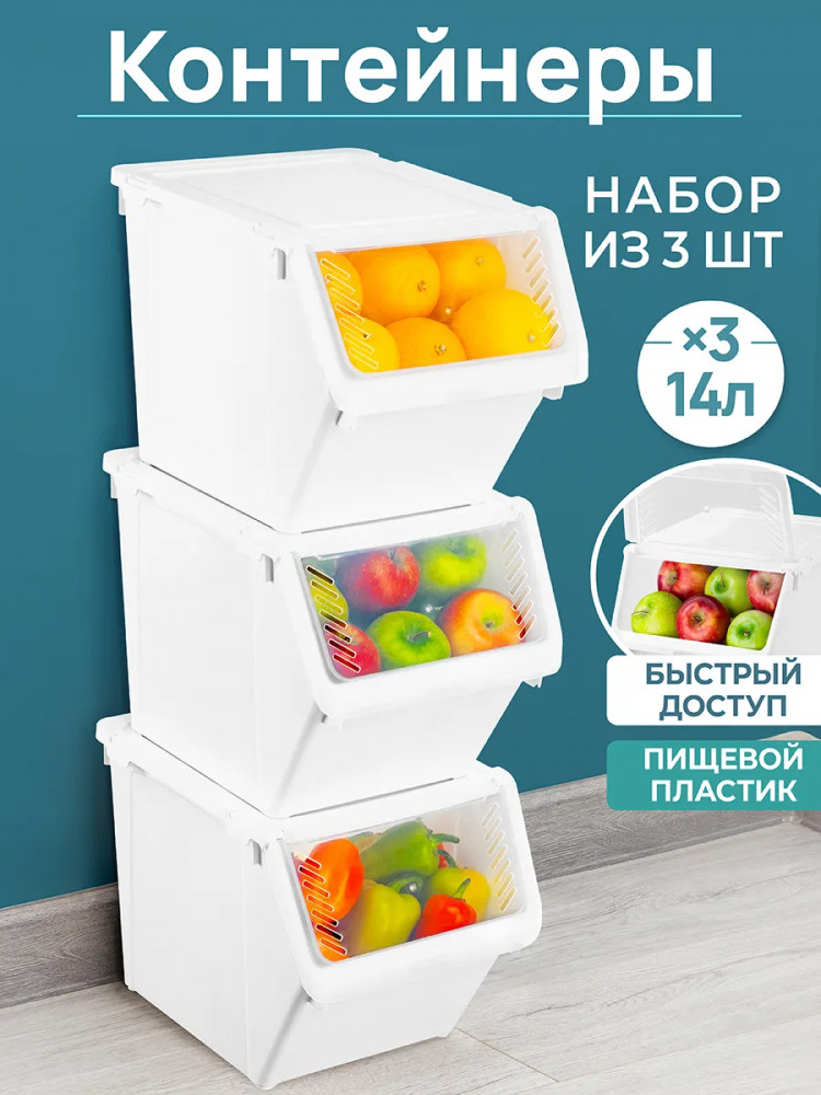 Набор из 3 контейнеров по 14,5 литра поможет организовать хранение овощей. Каждую ёмкость можно использовать как большой лоток для свежей зелени или под фрукты. Размер одной пластиковой коробки — 25,5×35×25 см, размер её дна — 20,5×23 см. Овощной (фруктовый) бокс выполнен из пищевого пластика — полипропилена. Этот материал не содержит бисфенол А и не выделяет вредных веществ, поэтому идеально подходит для хранения продуктов. Короб имеет крышку с отверстиями для вентиляции, поэтому поможет надолго сохранить картофель, лук или чеснок свежими! Коробочка отлично подойдёт для любителей ягод или фруктов, ведь она вмещает большое количество яблок или мандаринов. Универсальный кухонный инвентарь станет удобным приспособлением для организации порядка в любом пространстве.